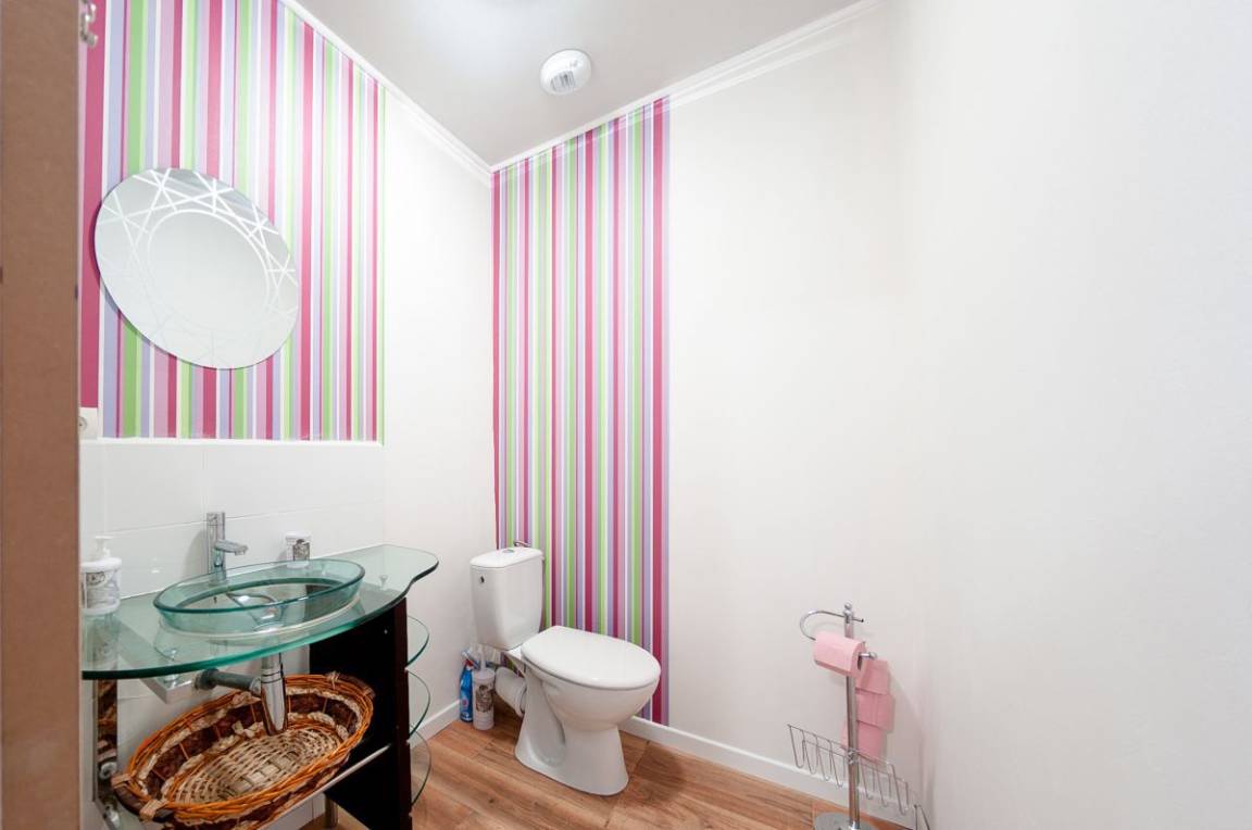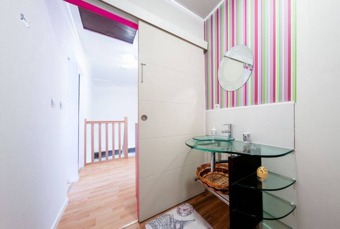 Obergeschoss: 2 Schlafzimmer (2 Doppelbetten 90x190, 1 Doppelbett 140x190), Badezimmer mit Waschbecken.