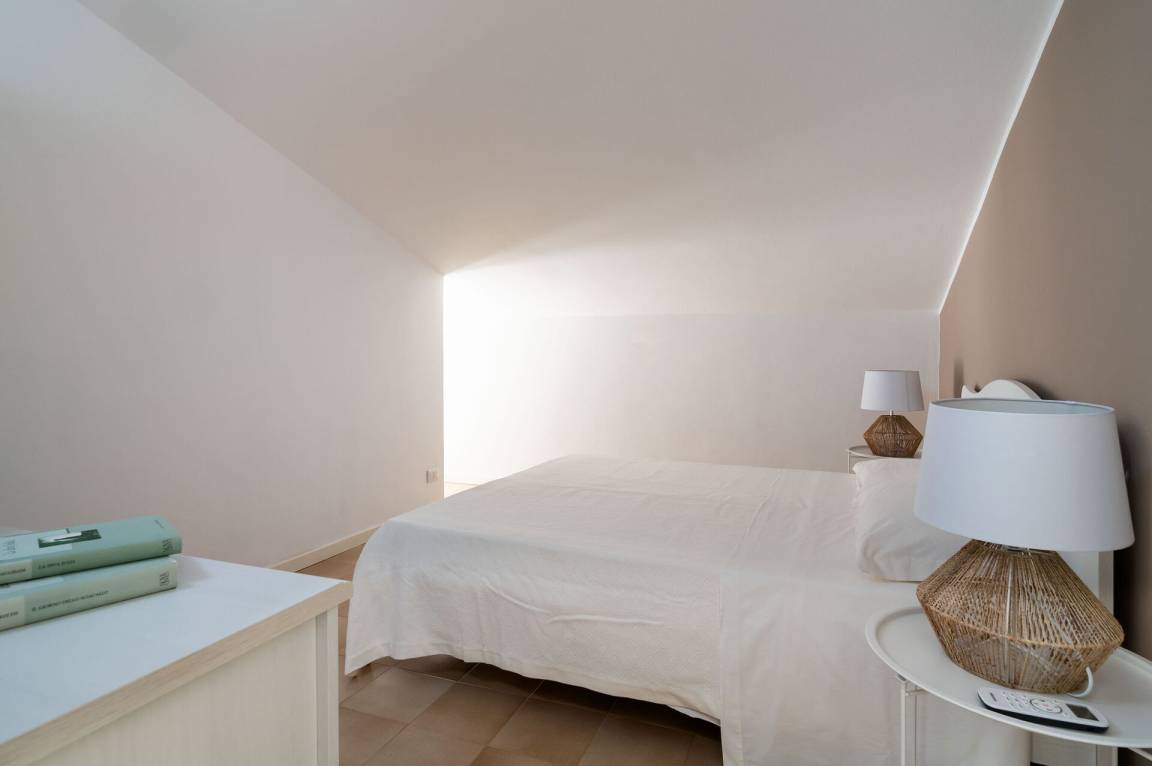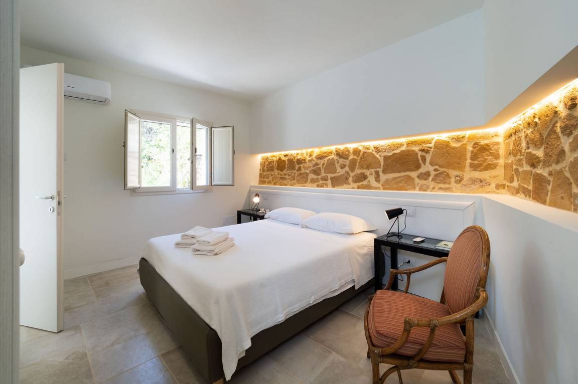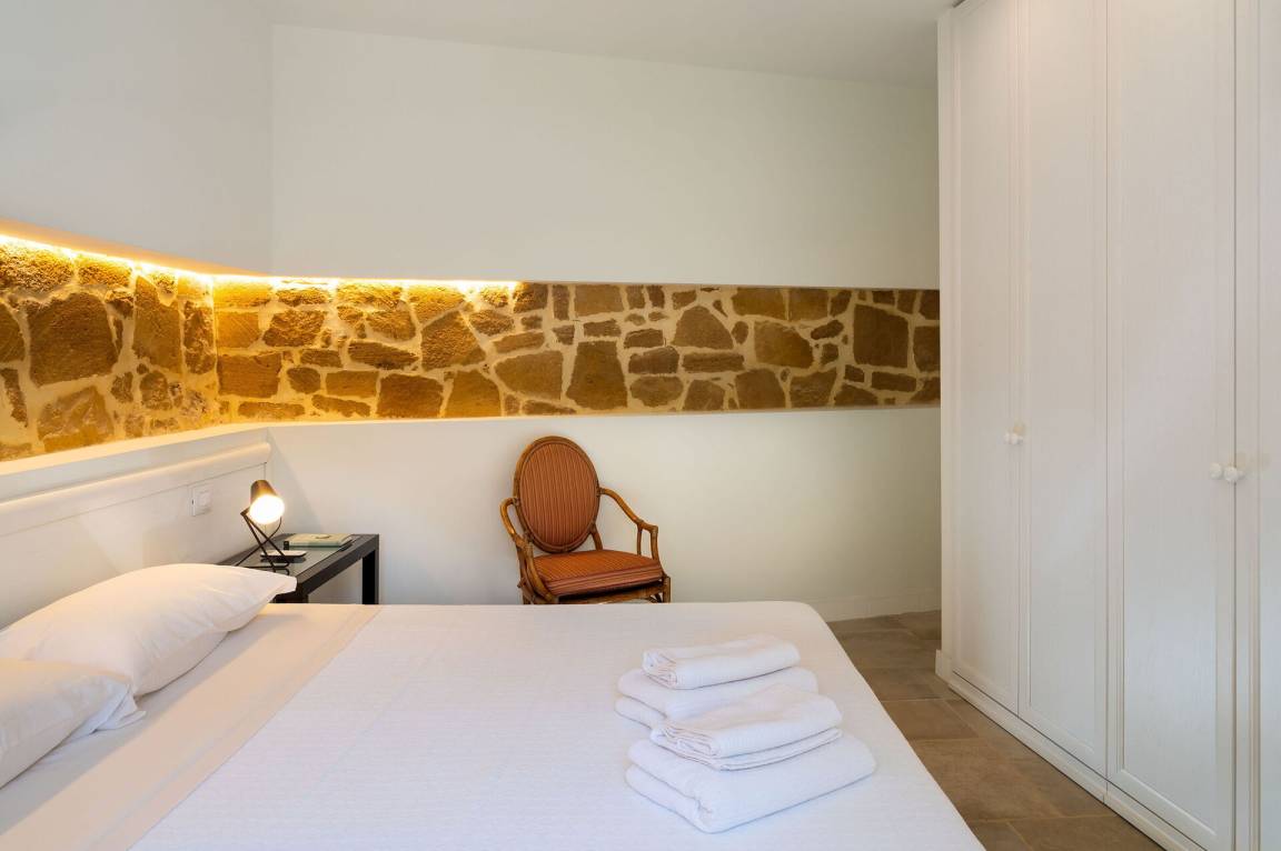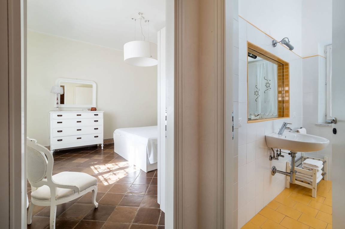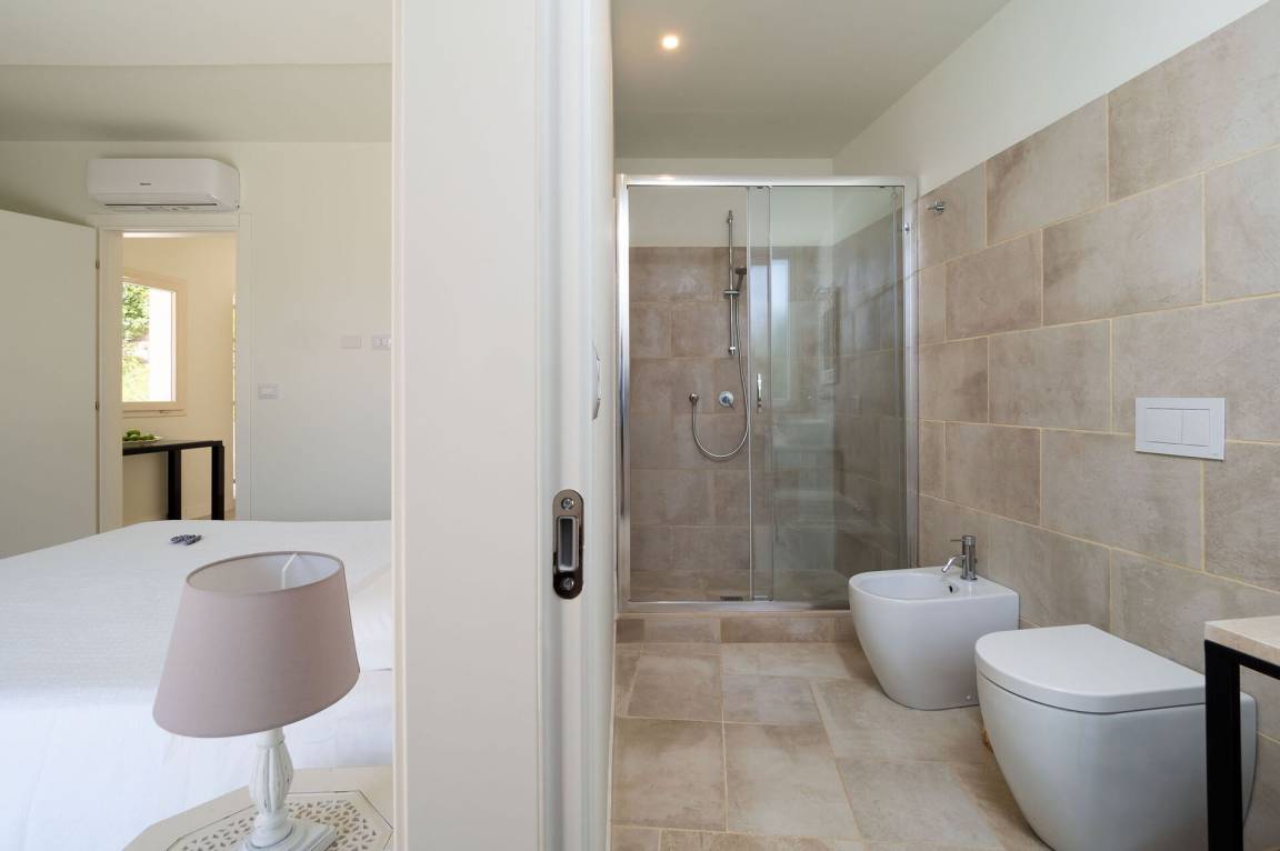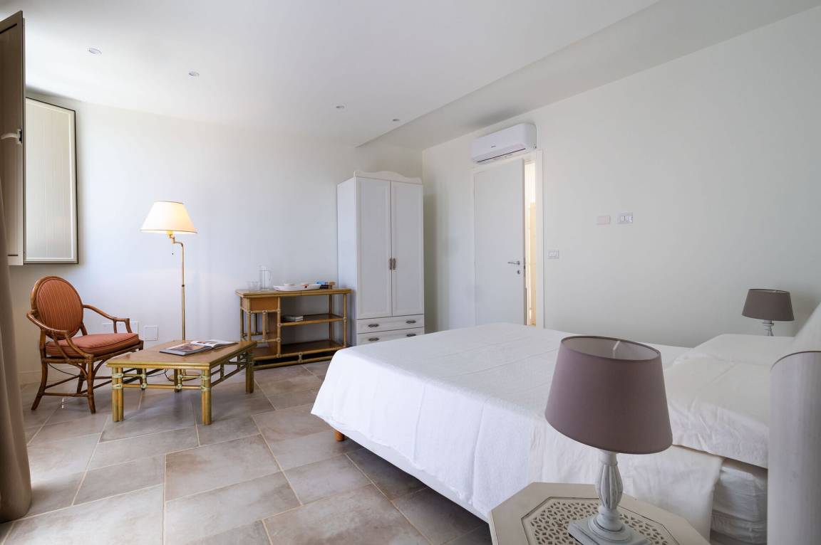 Schlafzimmer mit Bad 2: Doppelbett, WiFi Internet, Internet, Klimaanlage, Sessel, Waschbecken, WC, Bidet, Dusche, Ausgang auf den Patio.