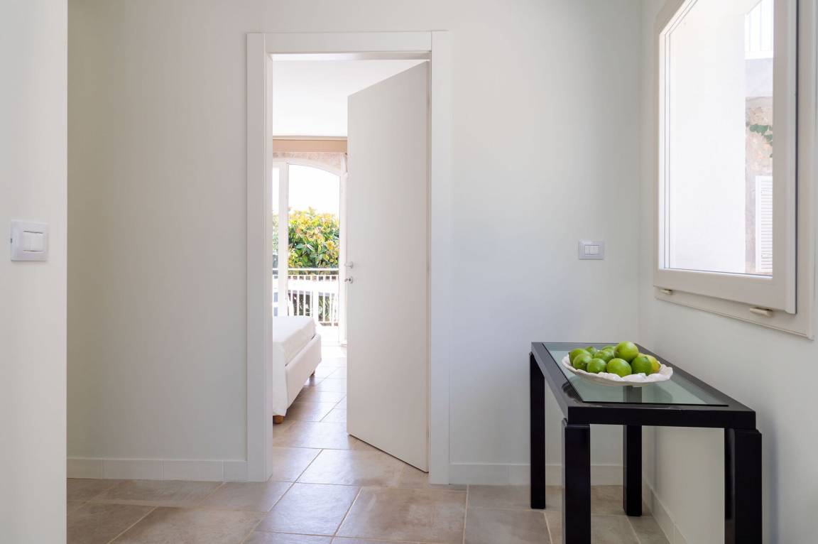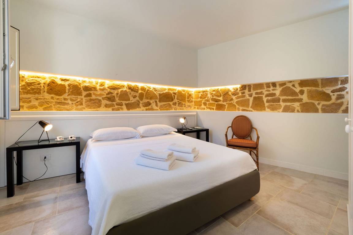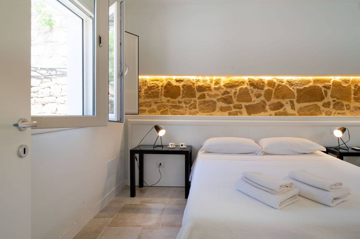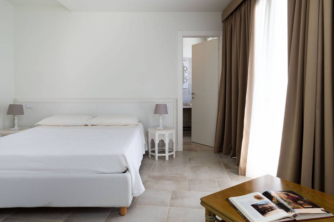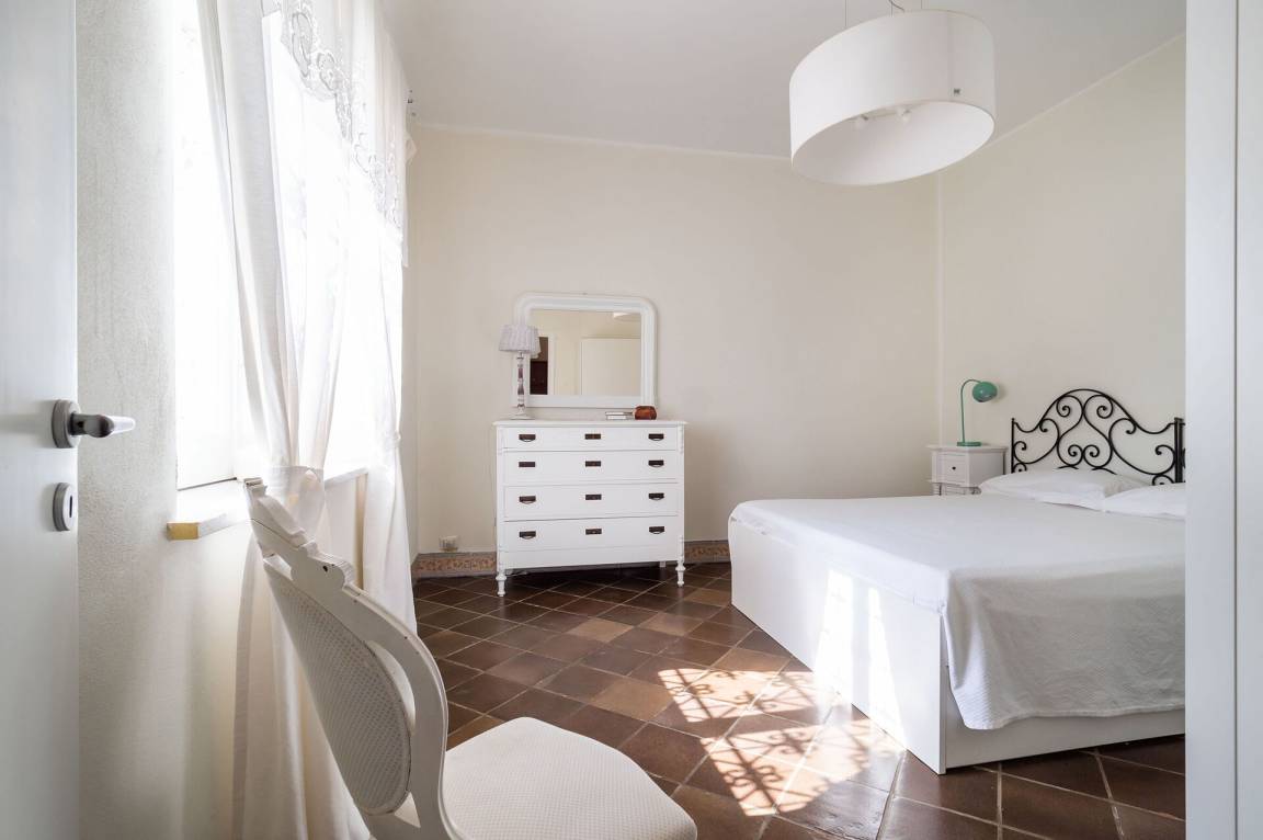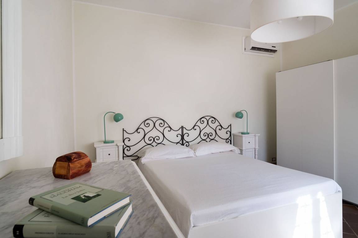 Schlafzimmer mit Bad 2: Doppelbett, WiFi Internet, Internet, Klimaanlage, Sessel, Waschbecken, WC, Bidet, Dusche, Ausgang auf den Patio.