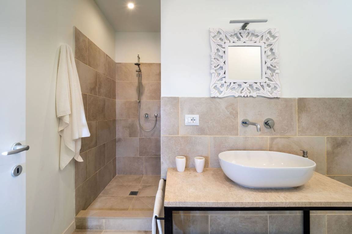Schlafzimmer mit Bad 1: Doppelbett, WiFi Internet, Internet, Fliegengitter, Sessel, Waschbecken, WC, Bidet, Dusche, Ausgang auf die Terrasse.