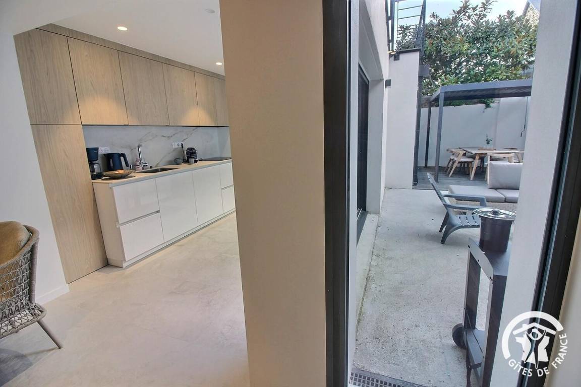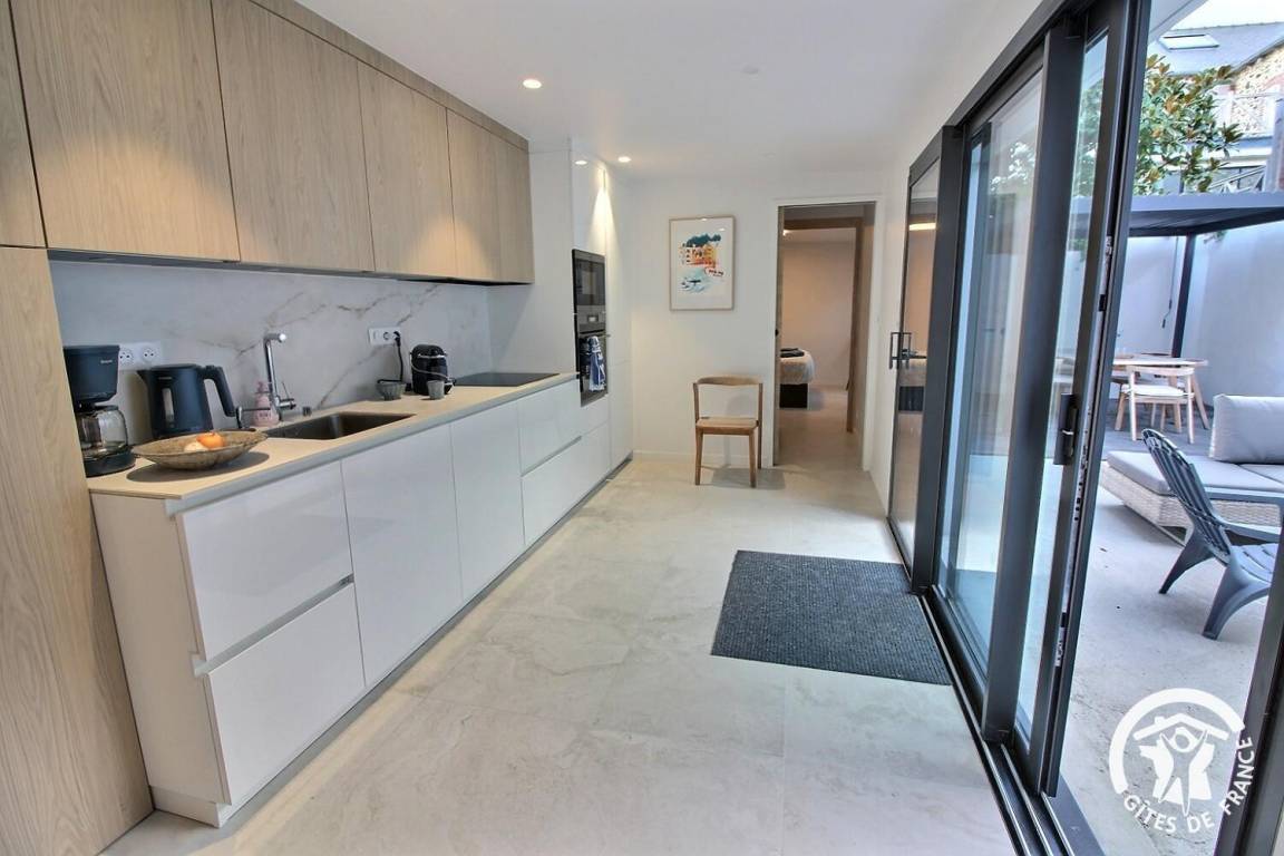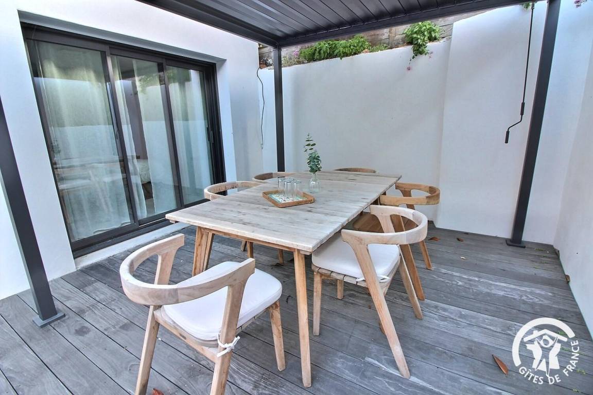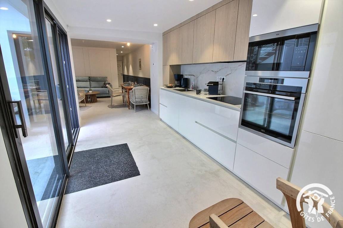 Diese Doppelhaushälfte, ebenerdig, sorgfältig und raffiniert eingerichtet, verfügt über eine helle, von den Eigentümern gestaltete Terrasse, die den fehlenden Garten kompensiert. Der Wohn- und Essbereich lädt nach einem Tag am Meer zum Entspannen ein.