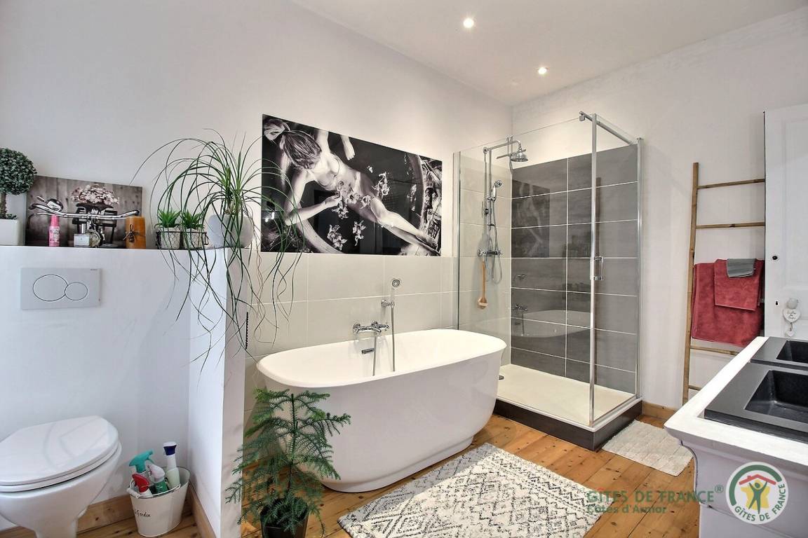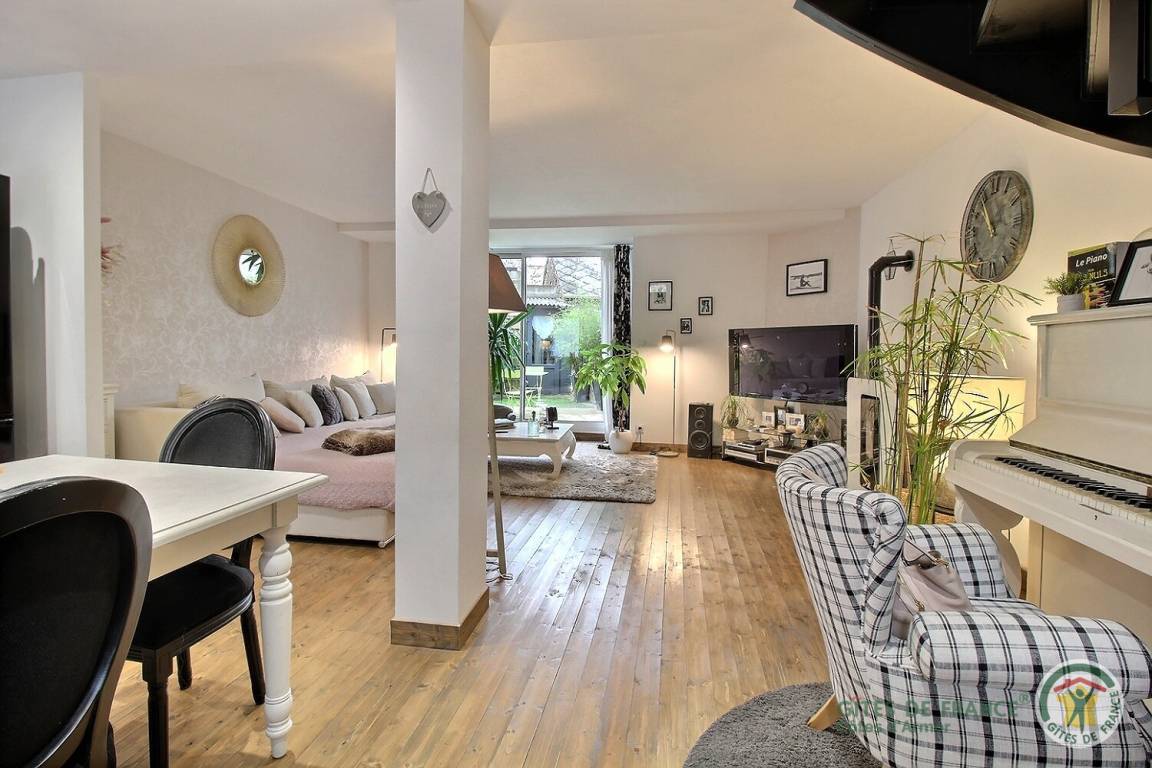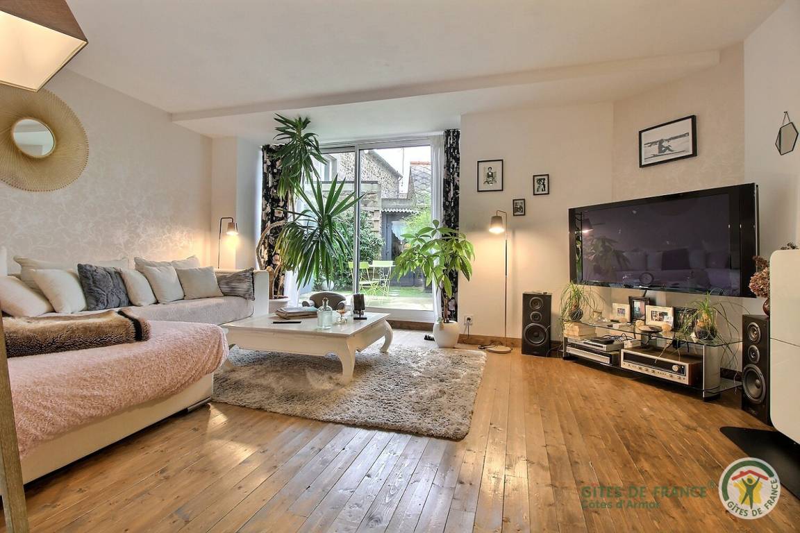 Ihre Ferienwohnung umfasst im Erdgeschoss, über 3 Stufen erreichbar: großes Wohnzimmer (TV mit Canal+-Abonnement – Netflix – Deezer), gut ausgestattete Einbauküche, 1 separates WC mit Handwaschbecken. Etage: 1 großes Schlafzimmer mit Ankleidezimmer (1 160x200 Bett), schönes Badezimmer (Dusche, Badewanne und WC). Geschlossener Innenhof von 20 m² mit Gartenmöbeln. Parken auf einem kostenlosen öffentlichen Parkplatz gegenüber.