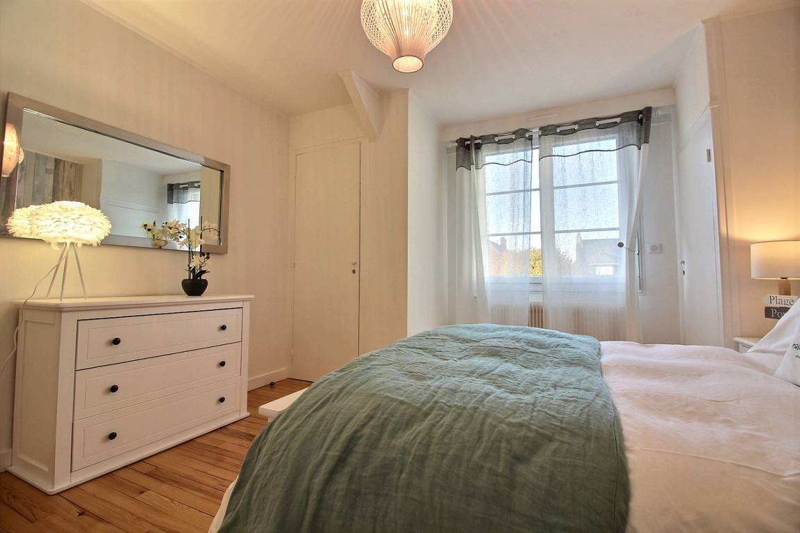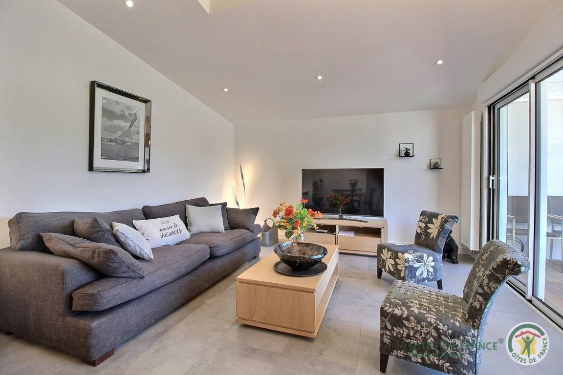 Ihre Ferienwohnung umfasst im Hochparterre: Eingangshalle, Wohnzimmer, das sich auf eine geschützte Terrasse öffnet und mit einer sehr gut ausgestatteten Einbauküche kommuniziert, 1 Schlafzimmer (1 Bett 160x200) mit angrenzendem privatem Badezimmer (begehbare Dusche), separate Toilette mit Waschbecken. Obergeschoss: 2 Schlafzimmer (1 Bett 140x190) (1 Bett 160x200), Badezimmer (Badewanne und WC). Garage im Erdgeschoss. Eingezäuntes Grundstück von 295 m² und Terrasse.