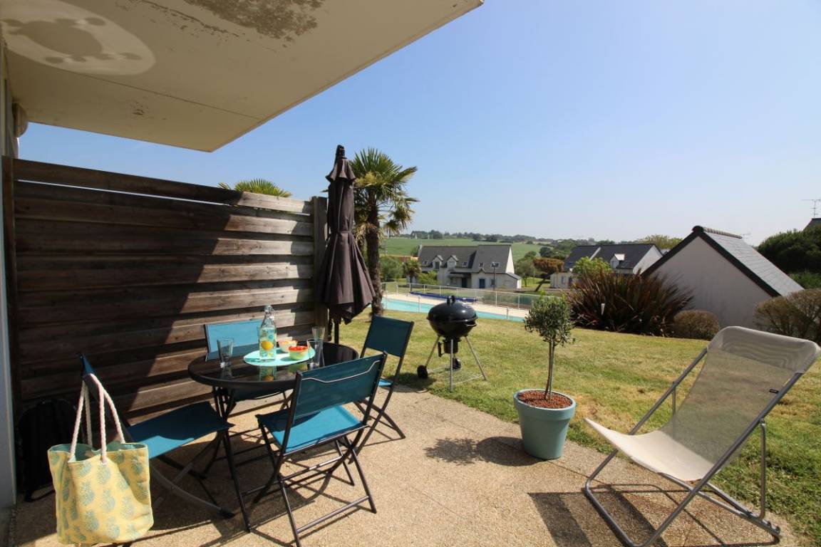 – eine kleine Terrasse mit Blick auf einen Garten, der mit den anderen Häusern der Anlage geteilt wird,