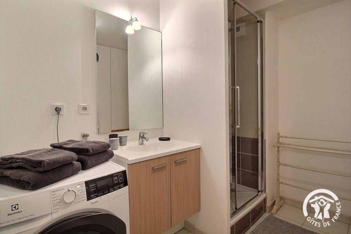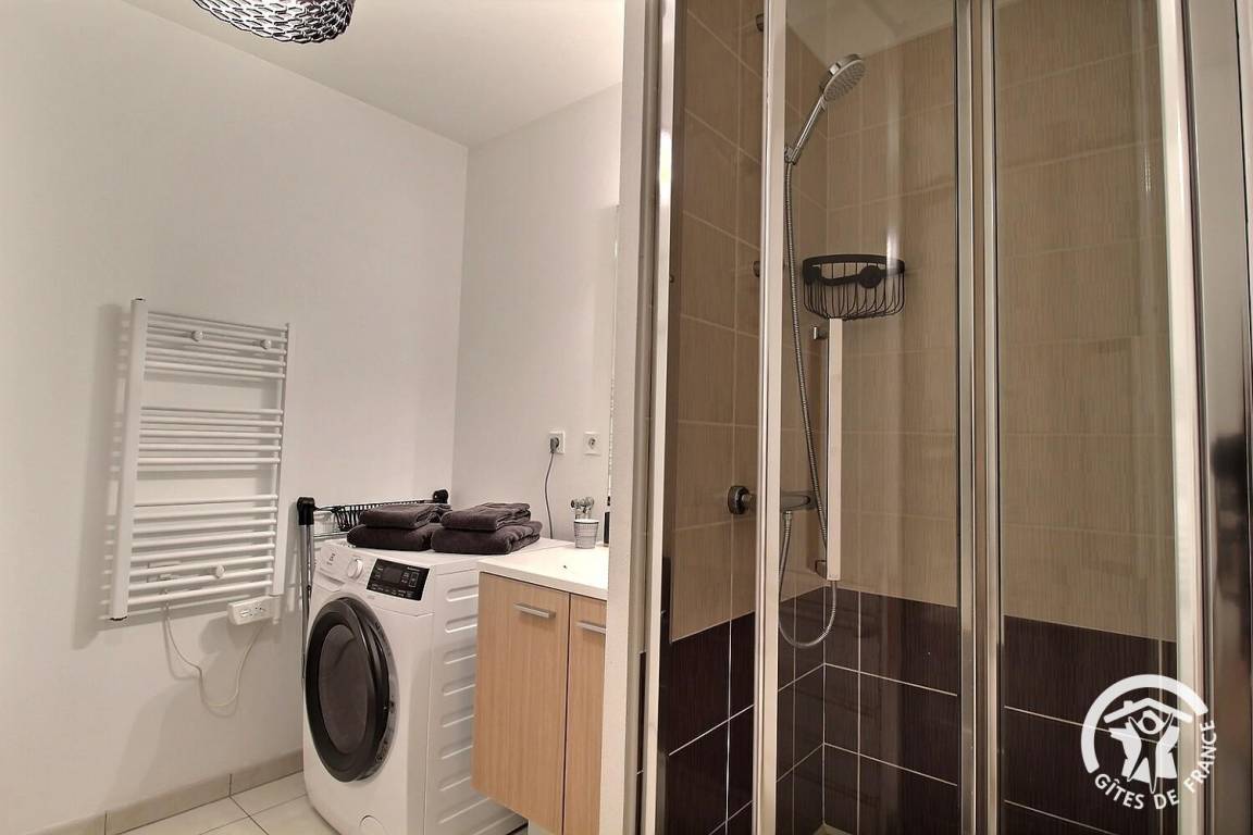 - Ein Badezimmer mit Dusche und Waschtrockner