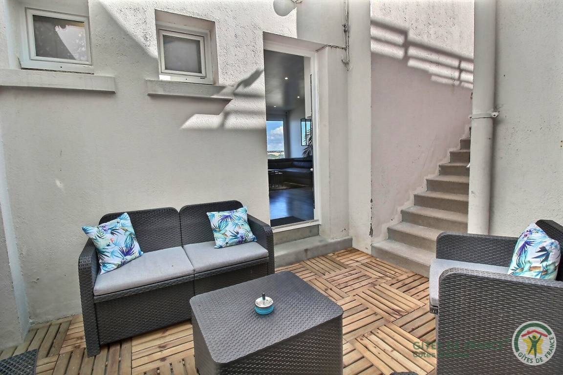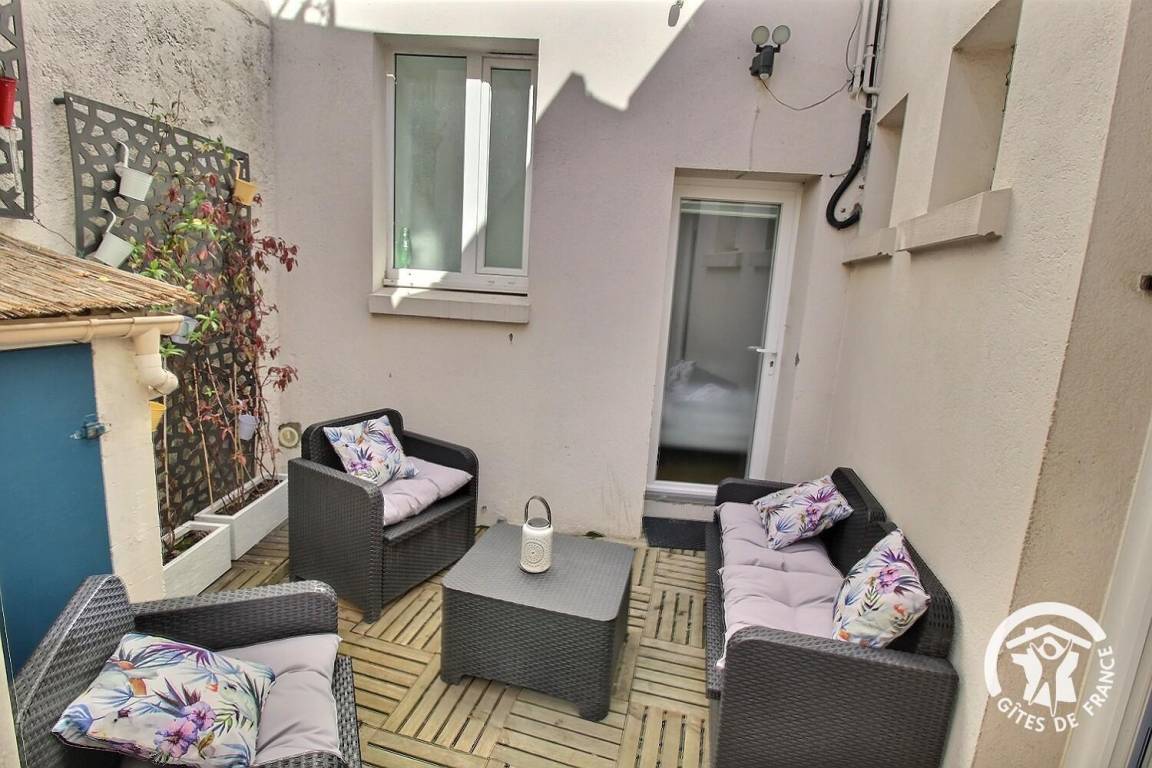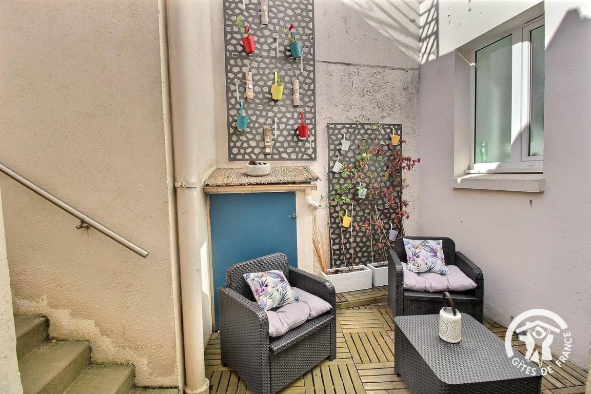 8 m² großer Innenhof mit Entspannungslounge. Ein Keller ist vom GR34-Wanderweg aus zugänglich und eignet sich beispielsweise zum Abstellen von Fahrrädern.