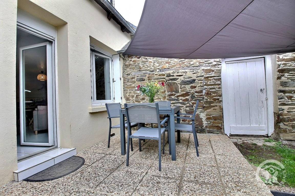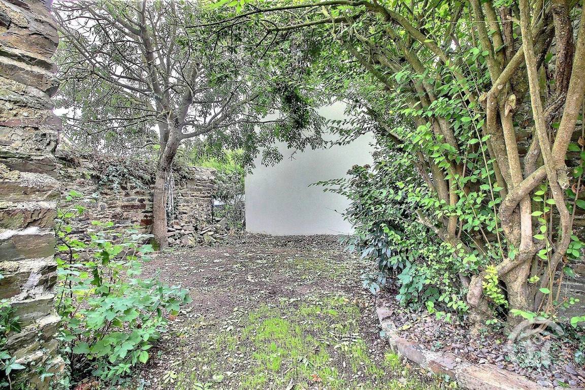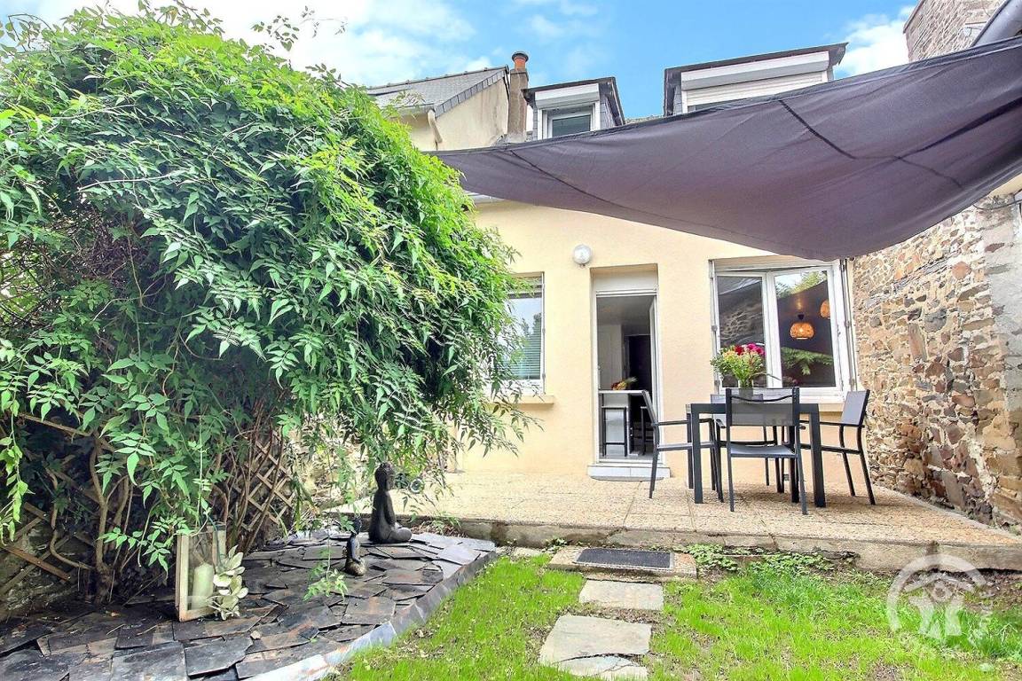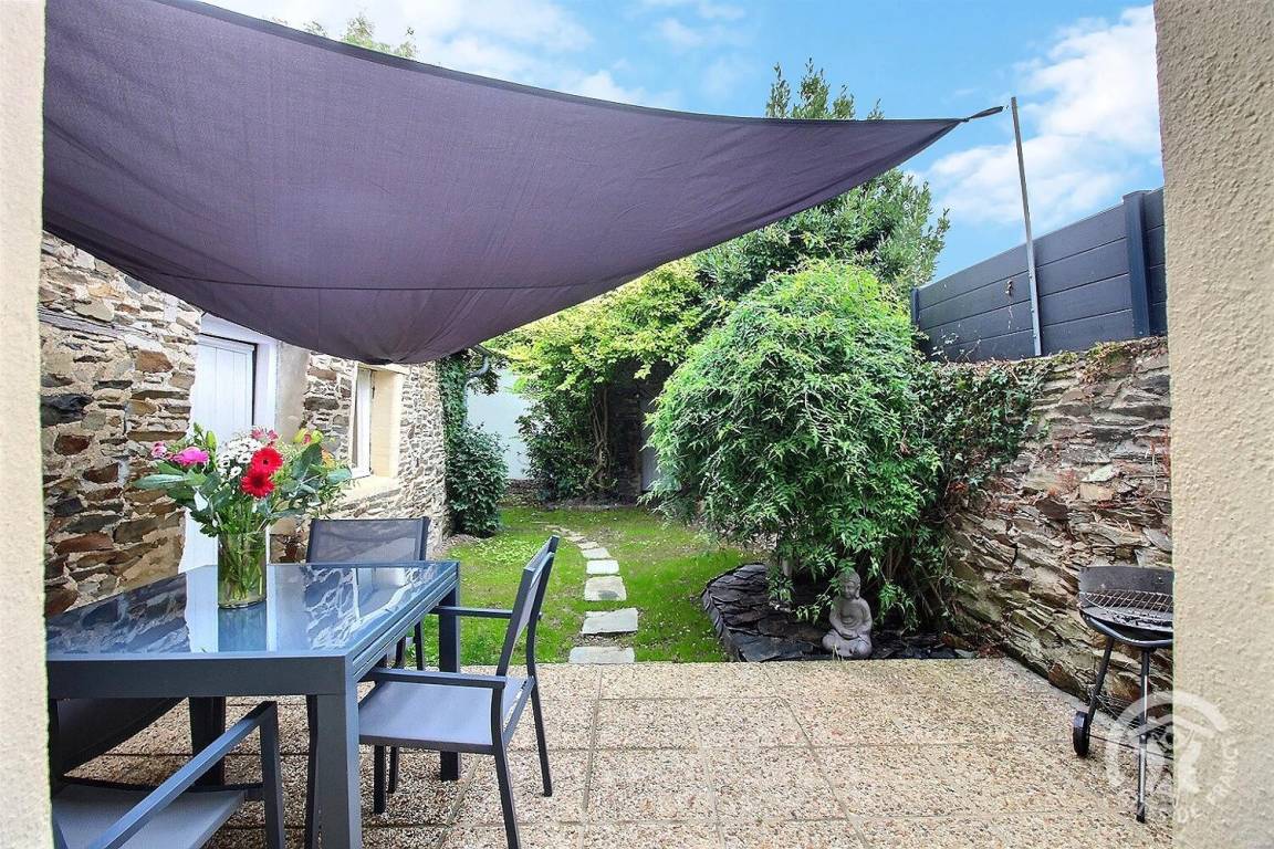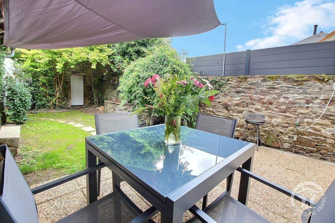Südostseite: Das Wohnzimmer öffnet sich auf die 10 m² große gepflasterte Terrasse und einen kleinen Garten von 72 m², alles umzäunt.