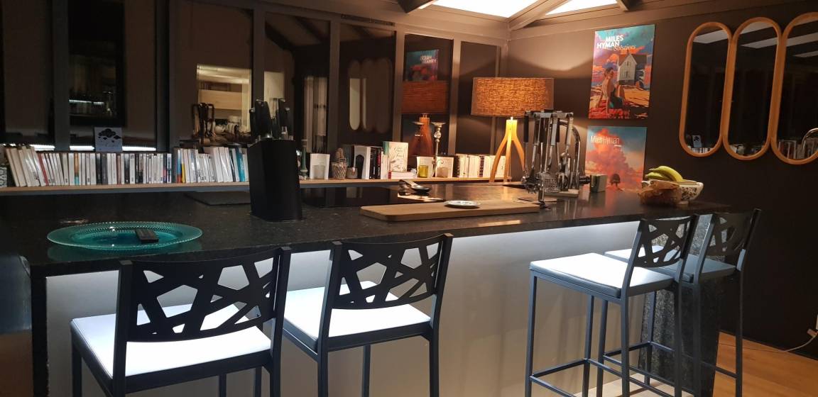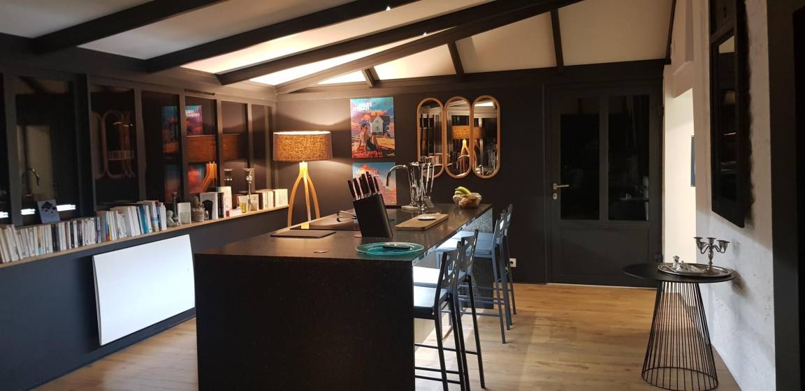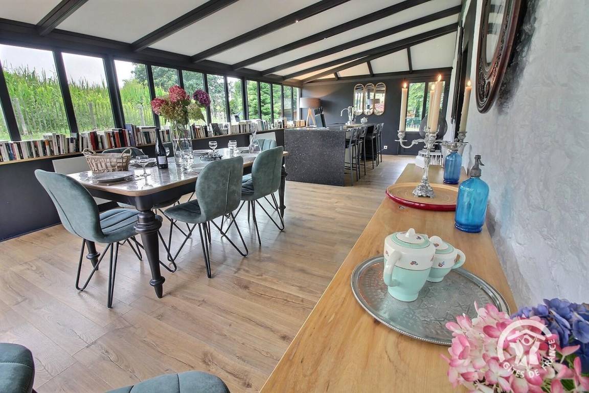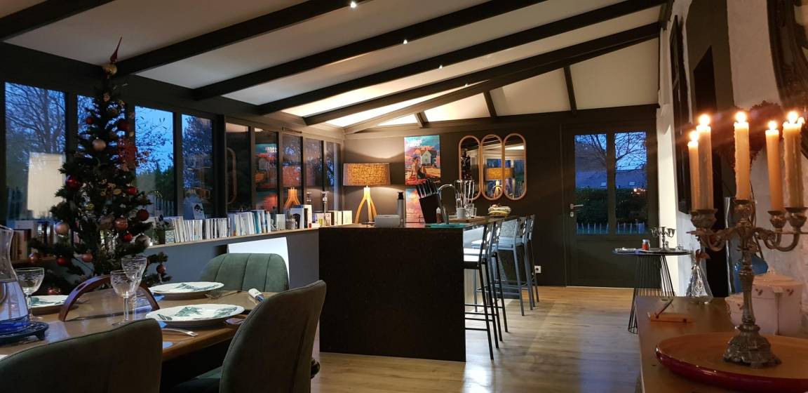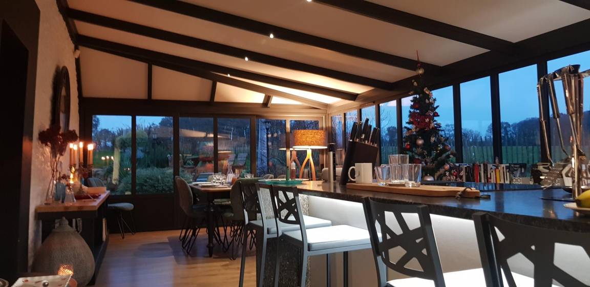 Ein herrlicher, geräumiger und heller Wintergarten mit integrierter Einbauküche inklusive Kochinsel und einem stilvollen Wohnzimmer.