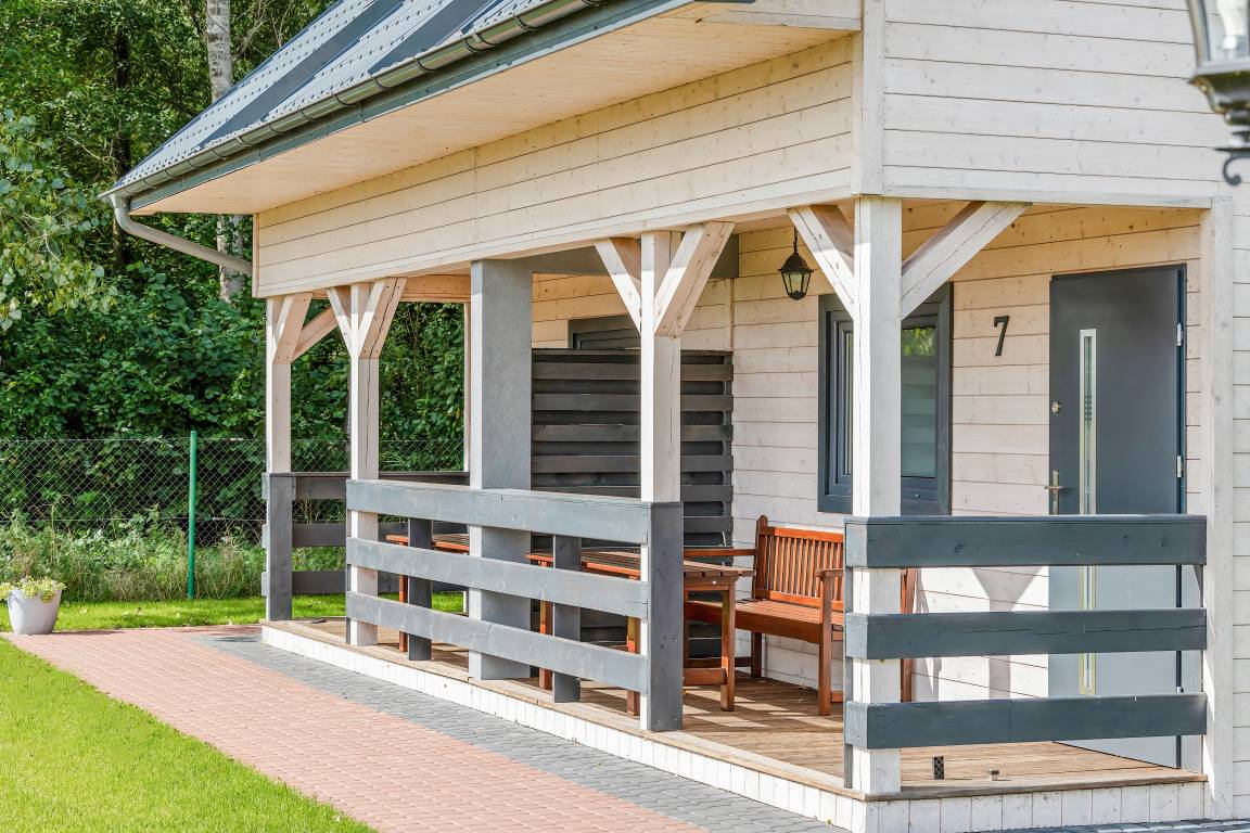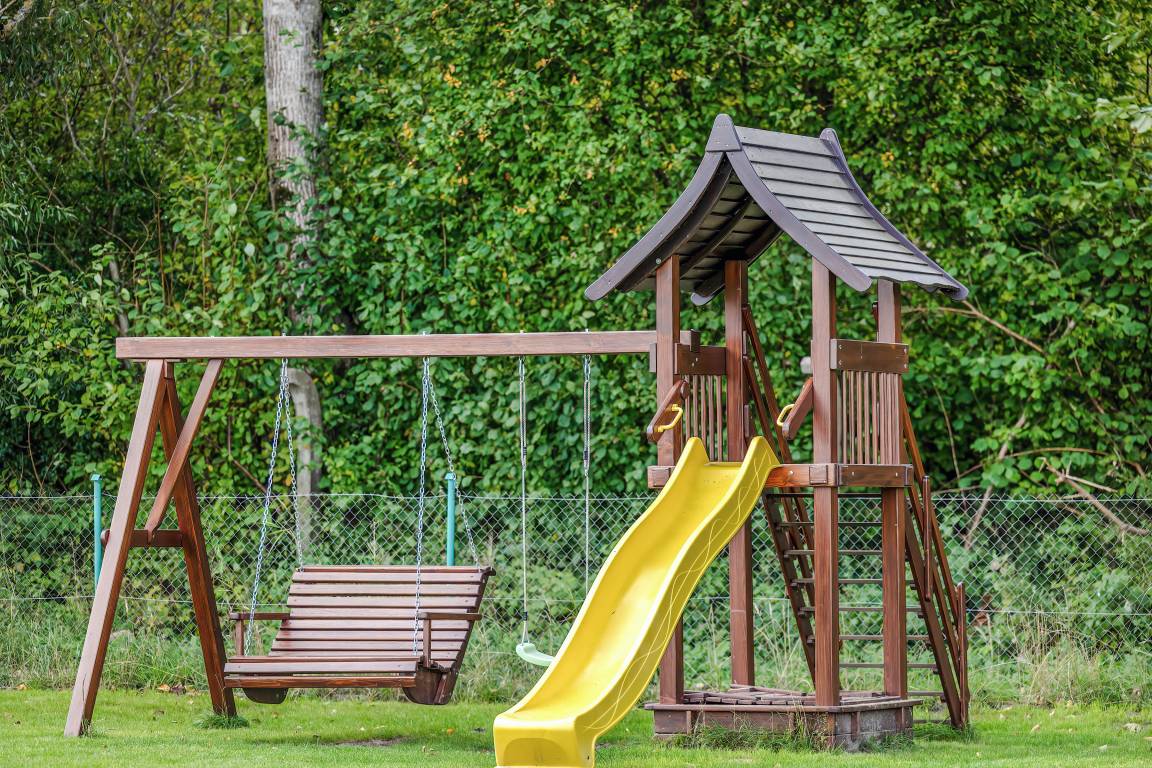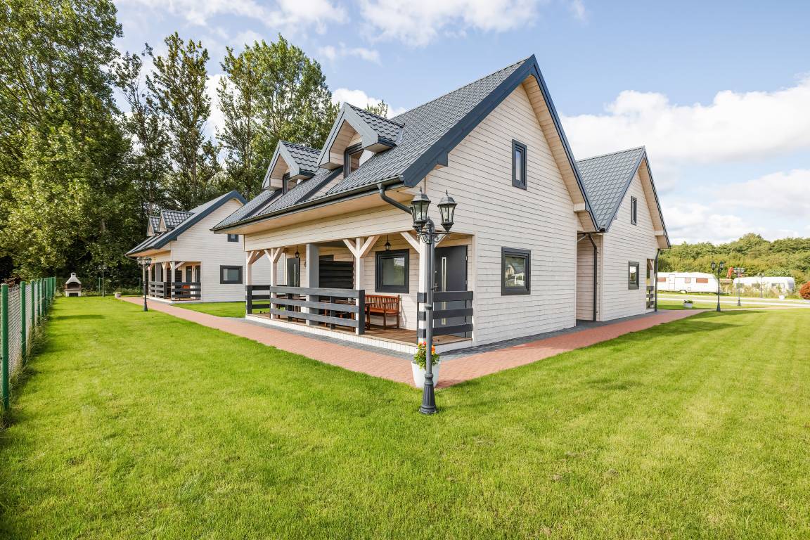 Haus: Schöne Ferienhaussiedlung auf einem großen, gepflegtem Grundstück am Waldrand, 2019 neu erbaut. Gemütliche Doppelhaushälften mit geschmackvoller Einrichtung. Internet (WLAN) über LTE. Heizung durch E-Radiator im Wohnzimmer (auf Wunsch). Warmwasser über E-Boiler (50 l). Terrasse mit Sitzmöbeln, gemauertem Grill zur gemeinschaftlichen Nutzung. In der Anlage: kleiner Spielplatz mit Schaukeln, Rutsche, Trampolin, Volleyballfeld. 1 Parkplatz/ Ferienhaus auf dem umzäunten Grundstück. Hinweis: Wir empfehlen eine Belegung mit maximal 5 Personen auf Grund der schmalen Schlafcouch (110 cm Breite) im Tagesraum.
