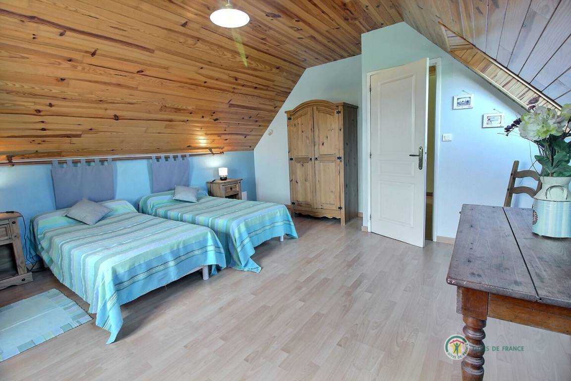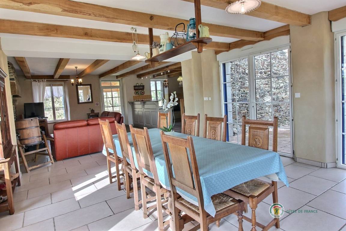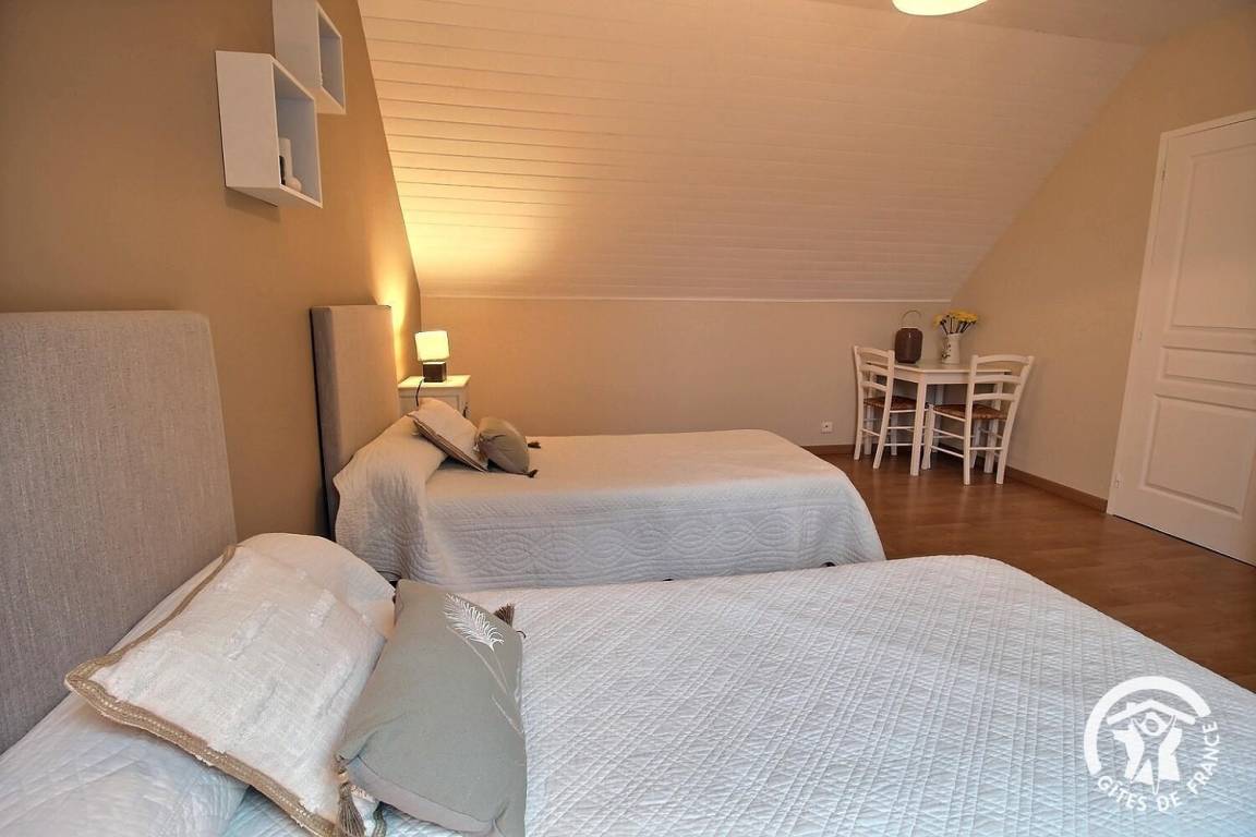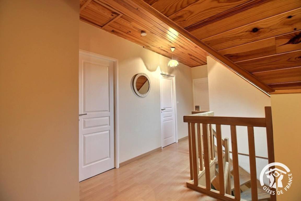 Ihre Ferienwohnung umfasst im Erdgeschoss: großes Wohnzimmer mit Küchenbereich - Esszimmer - Wohnzimmer (mit Kamin), 1 Schlafzimmer (1 Doppelbett), Badezimmer mit Dusche, WC. Obergeschoss: 3 Schlafzimmer (1 Doppelbett 160x200 und 4 Einzelbetten), Badezimmer mit Badewanne und Dusche, WC. Aerothermische Fußbodenheizung. Grundstück von 2000 m² mit Terrasse, Innenhof und Garten. Spiele für Kinder im Innen- und Außenbereich.