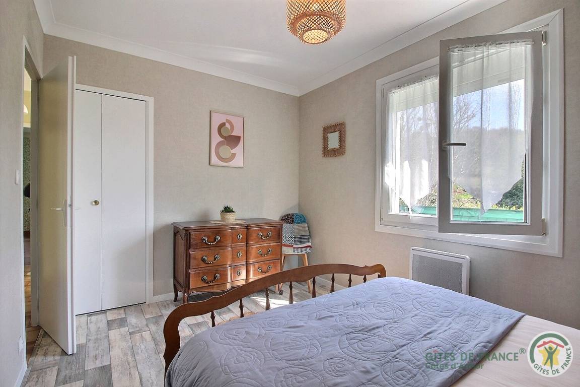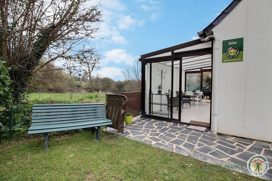 Ihre Ferienwohnung bietet Ihnen auf einer Ebene: ein Wohnzimmer mit Kamineinsatz und Einbauküche, ein Schlafzimmer (mit Doppelbett), ein Schlafzimmer (mit zwei Einzelbetten), ein Duschbad (mit großer Dusche), ein separates WC, eine 11 m² große Aluminiumveranda und eine 11 m² große Terrasse mit Blick auf den Garten und die umliegende Landschaft. Am Fuße des Grundstücks befindet sich ein kleines Nebengebäude, in dem Fahrräder und andere kleinere Ausrüstungsgegenstände (Kinderwagen, Dachbox etc.) problemlos Platz finden.
