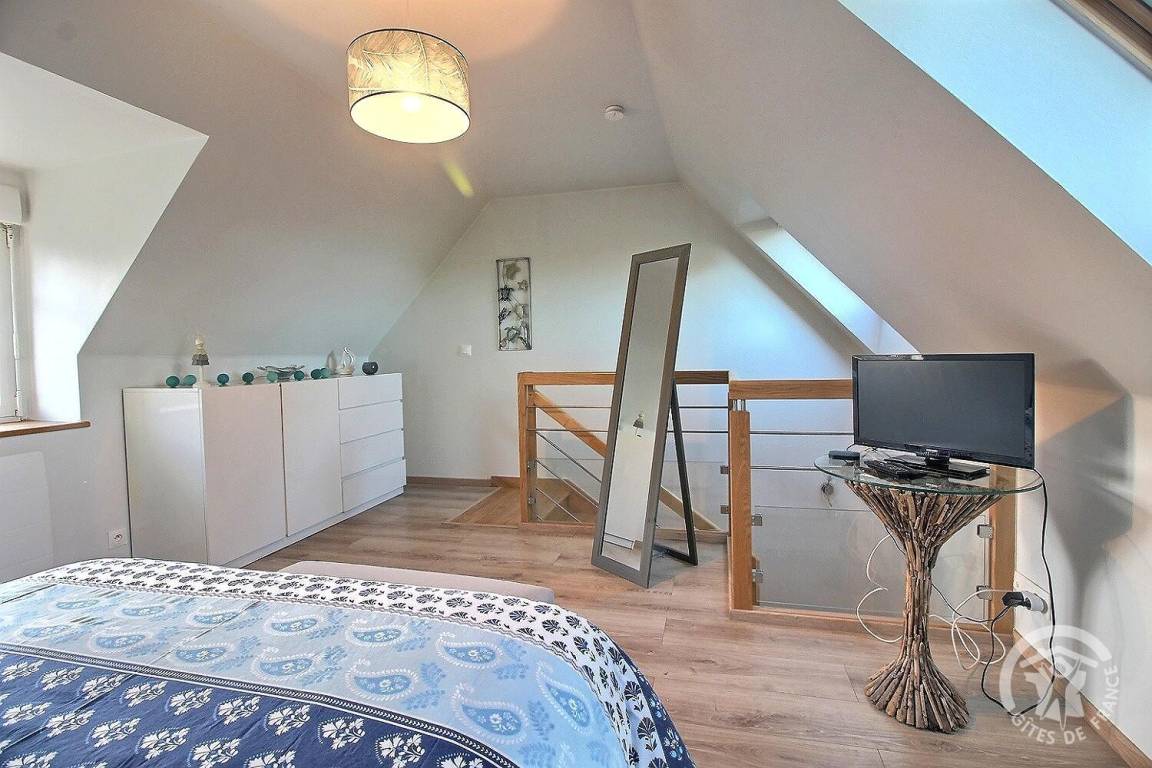- ein großes Schlafzimmer im Zwischengeschoss mit Fernseher und 1 Doppelbett. in 160 x 200.