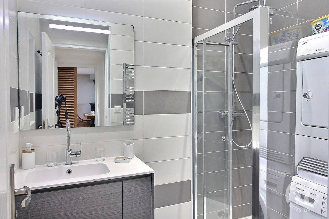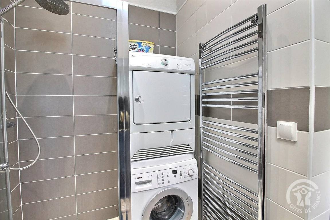 - ein Badezimmer mit Dusche, Waschbecken, Waschmaschine und Trockner,