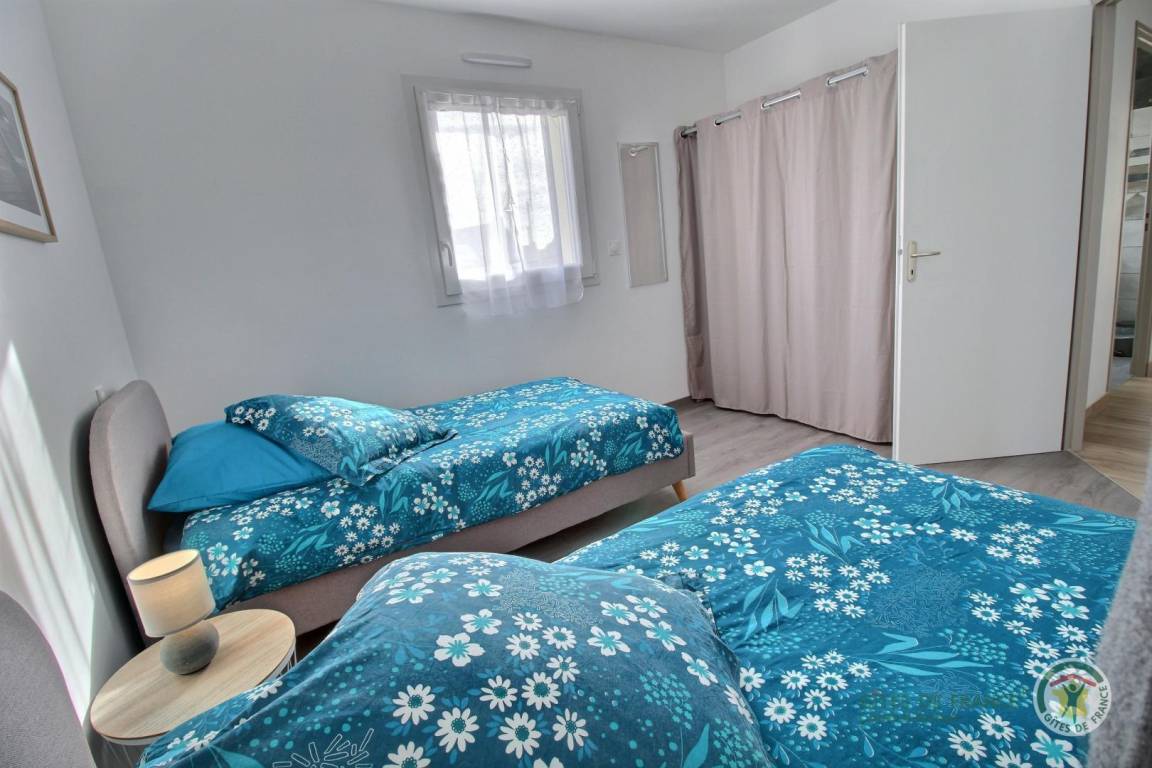Ihre ebenerdige Ferienwohnung beinhaltet: hübsche Einbauküche, Wohnzimmer, drei Schlafzimmer (2 Betten 160x200, 2 Betten 90x200), Bad mit Dusche, WC. Zu Ihrer Verfügung: 40 m² Terrasse, 800 m² Privatgarten. Parken Ihrer Fahrzeuge im privaten Innenhof der Gîte (200 m²). Zur Information: Ein im Bau befindliches Haus neben der Gîte kann zu Belästigungen führen.