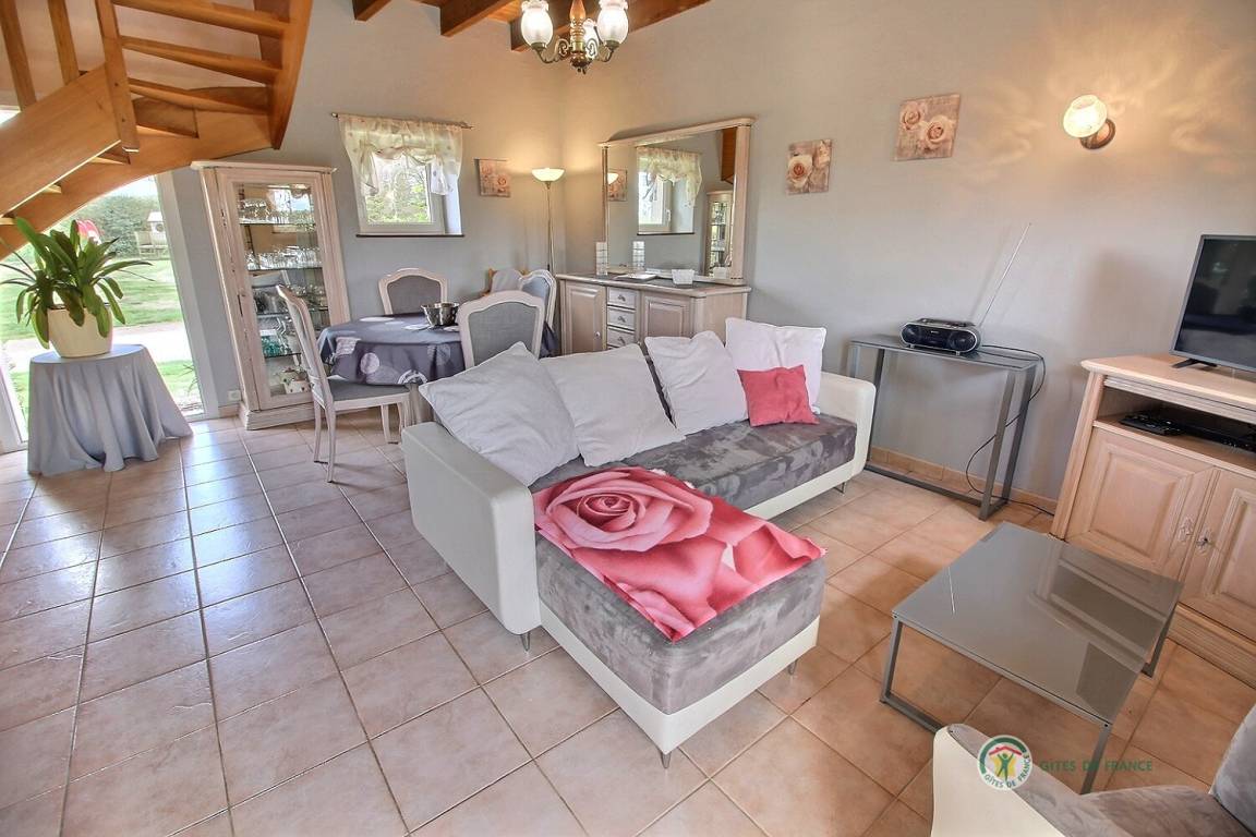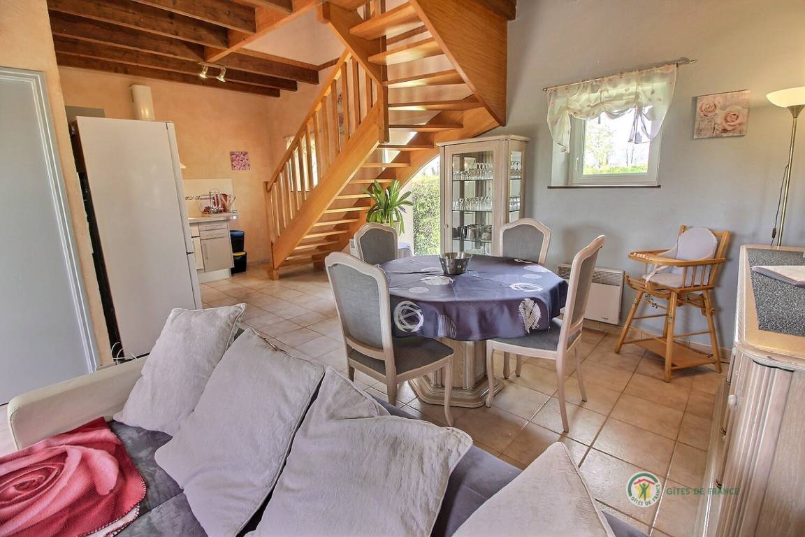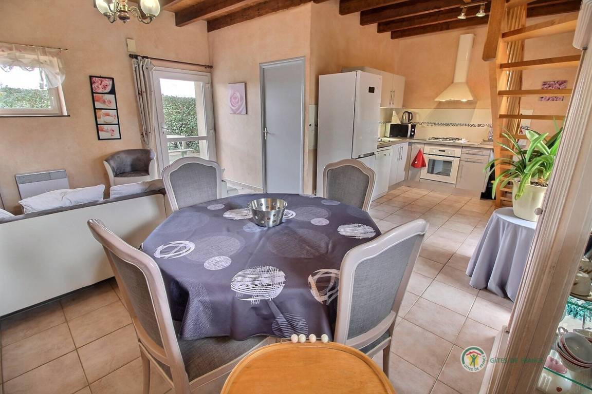3 renovierte Gites, Doppelhaus in einem Ensemble, in einer ruhigen Umgebung, mit seperatem Eingang, 500 m von einem Bauernhof gelegen. Erdgeschoss: Wohnzimmer mit eingebauter Küche und Essecke (37 qm), WC. Etage: 2 Schlaf-Zi. (1 Doppelbett, 2 Einzelbetten, 1 Kinderbett aus Holz), Bade-Zi. mit WC. Hof (60 qm) und Rasen von 500 qm. Bettwäsche vorhanden, Betten werden bei Ankunft bezogen. Babystuhl.