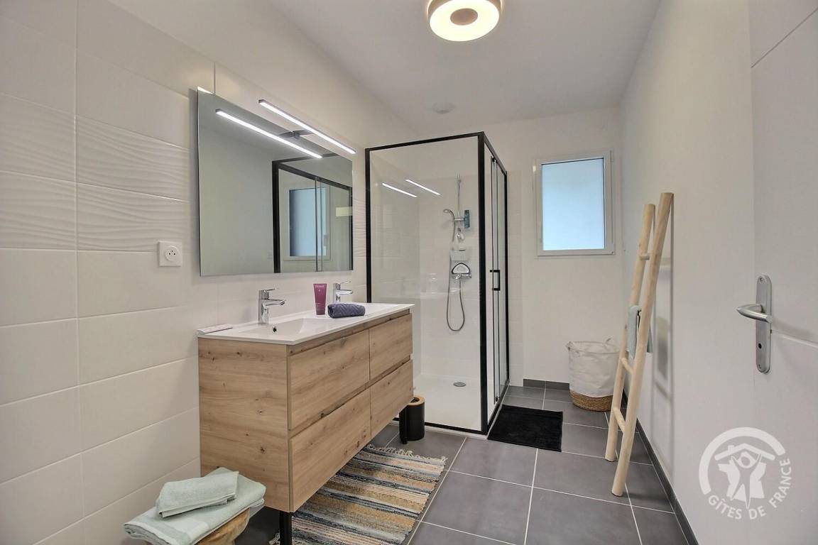Eingangshalle, Waschküche, 3 Schlafzimmer: eine Familiensuite mit (1 Bett 160 x 200), eigenem Bad (ebenerdige Dusche) und Ankleidezimmer, ein Schlafzimmer (2 Betten 80 x 200, die zusammengestellt werden können), ein Schlafzimmer (1 Bett 140 x 190) , ein weiteres Badezimmer (begehbare Dusche), separates WC.