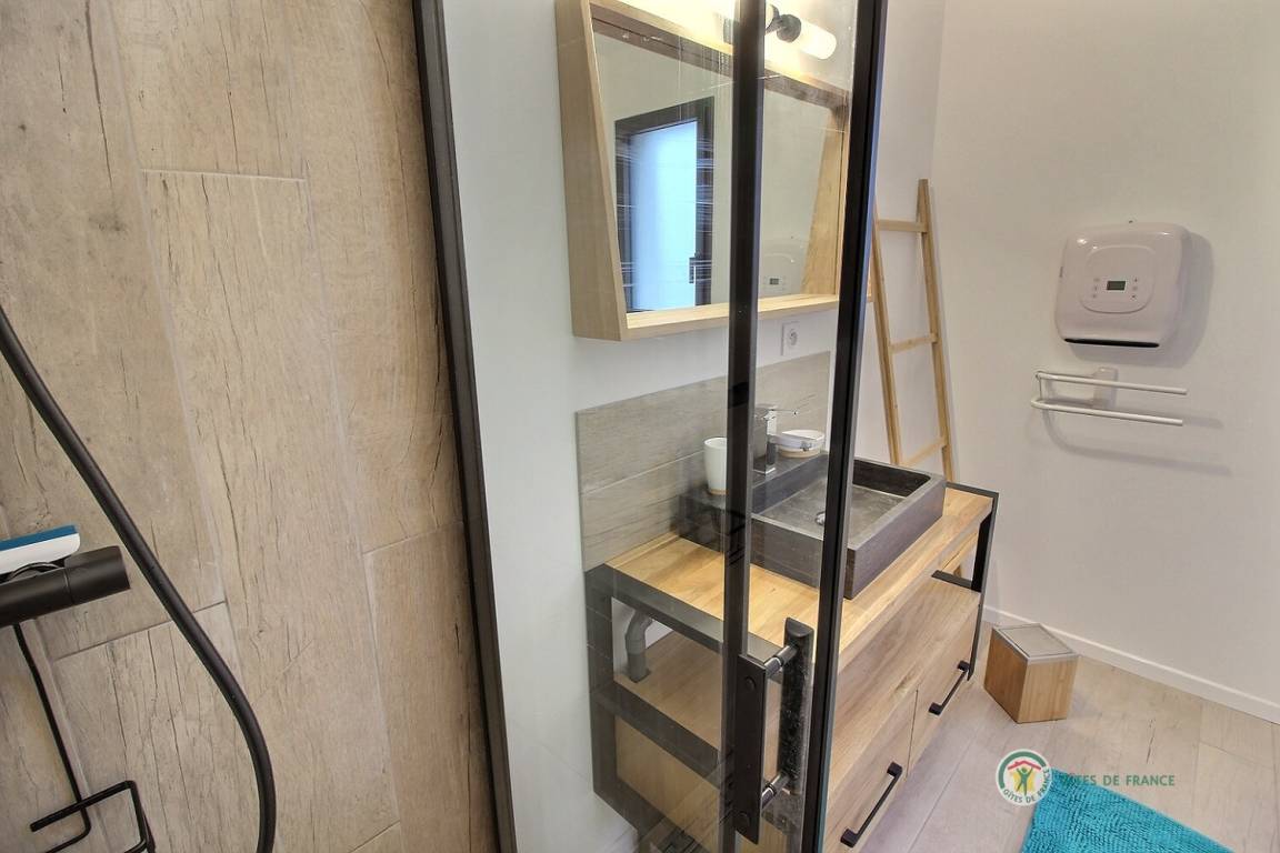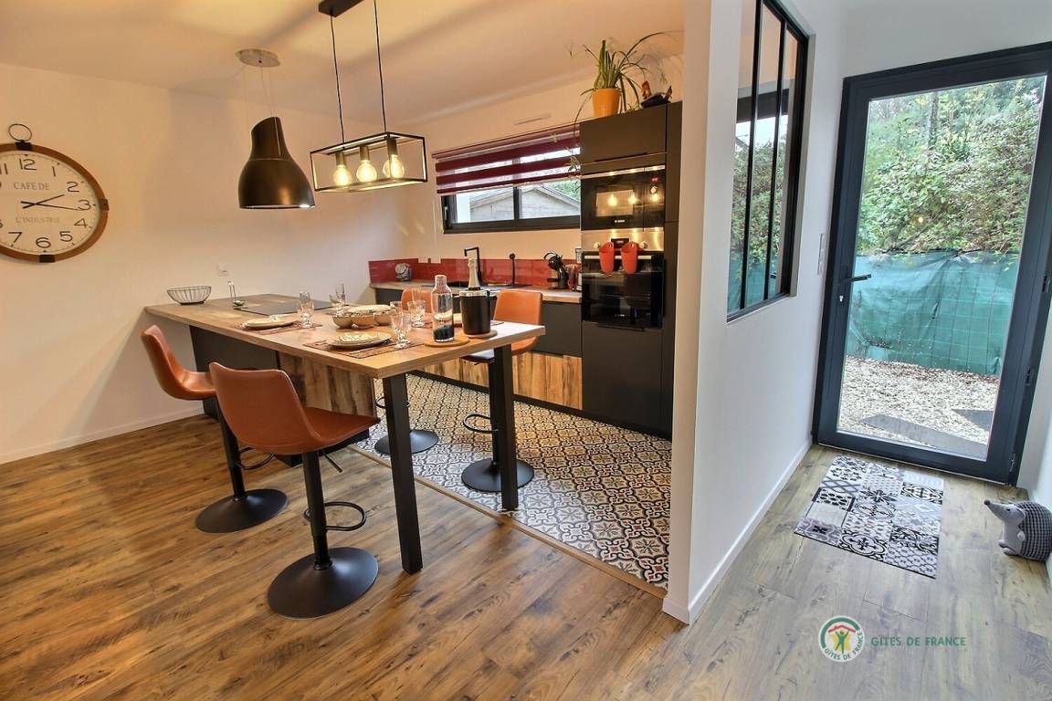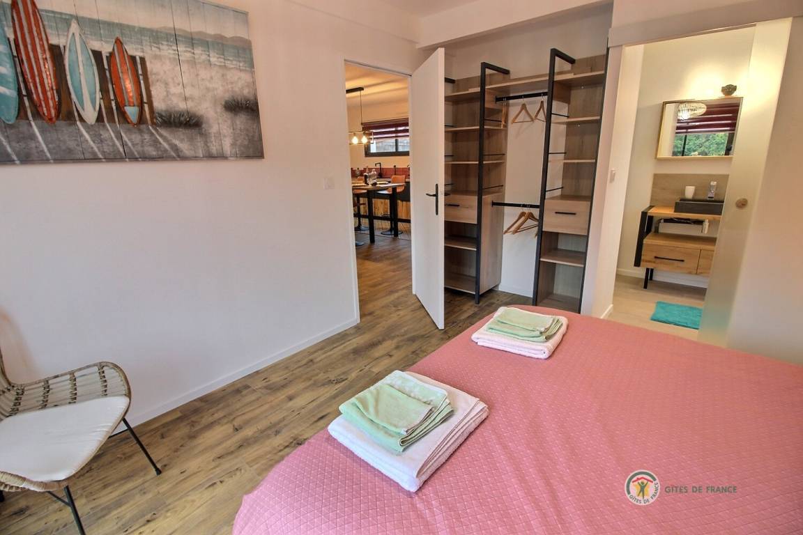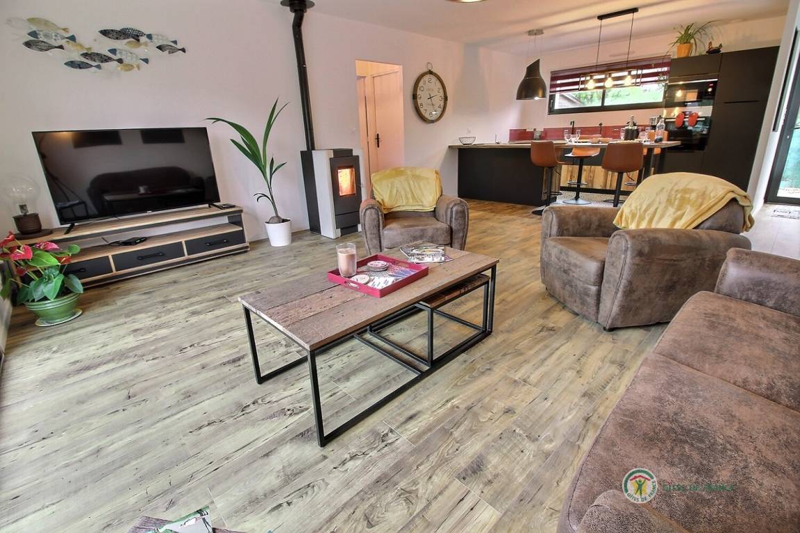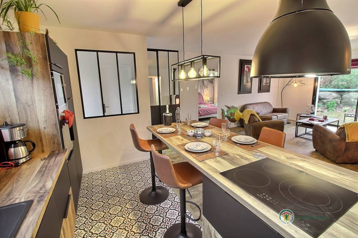 Ihre einstöckige Ferienwohnung umfasst: Kleine Eingangshalle, die zu einem Wohnzimmer und einer offenen Küche mit Pelletofen (mitgeliefert) führt, die angenehme Wärme in diesem Raum verbreiten wird, 1 Schlafzimmer mit 1 Bett 160x200 und seinem Badezimmer, privates Badezimmer mit Dusche, 1 weiteres Schlafzimmer mit 2 Betten 80x200, separates Badezimmer mit Dusche, separates WC mit Waschbecken. Privater Innenhof von 240 m², auf dem 2 Autos parken können, und eine große Holzterrasse von 50 m² sowie ein Unterstand für Ihre Fahrräder. Internet wird installiert.