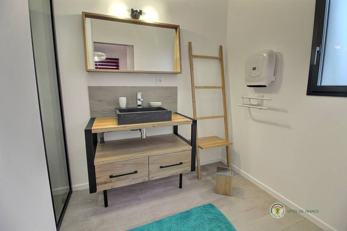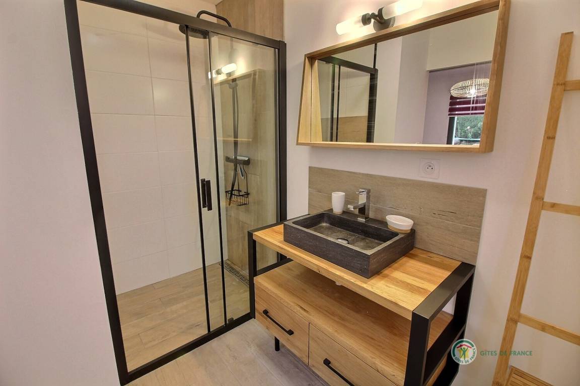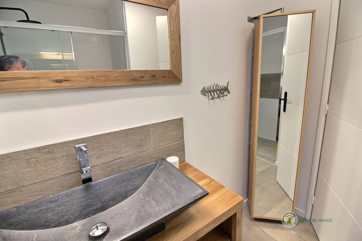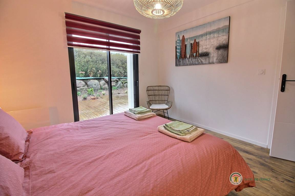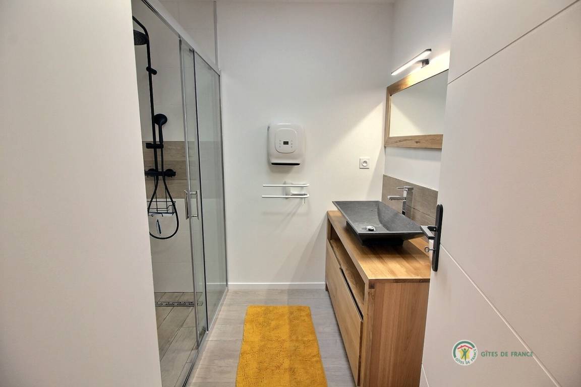 Ihre einstöckige Ferienwohnung umfasst: Kleine Eingangshalle, die zu einem Wohnzimmer und einer offenen Küche mit Pelletofen (mitgeliefert) führt, die angenehme Wärme in diesem Raum verbreiten wird, 1 Schlafzimmer mit 1 Bett 160x200 und seinem Badezimmer, privates Badezimmer mit Dusche, 1 weiteres Schlafzimmer mit 2 Betten 80x200, separates Badezimmer mit Dusche, separates WC mit Waschbecken. Privater Innenhof von 240 m², auf dem 2 Autos parken können, und eine große Holzterrasse von 50 m² sowie ein Unterstand für Ihre Fahrräder. Internet wird installiert.