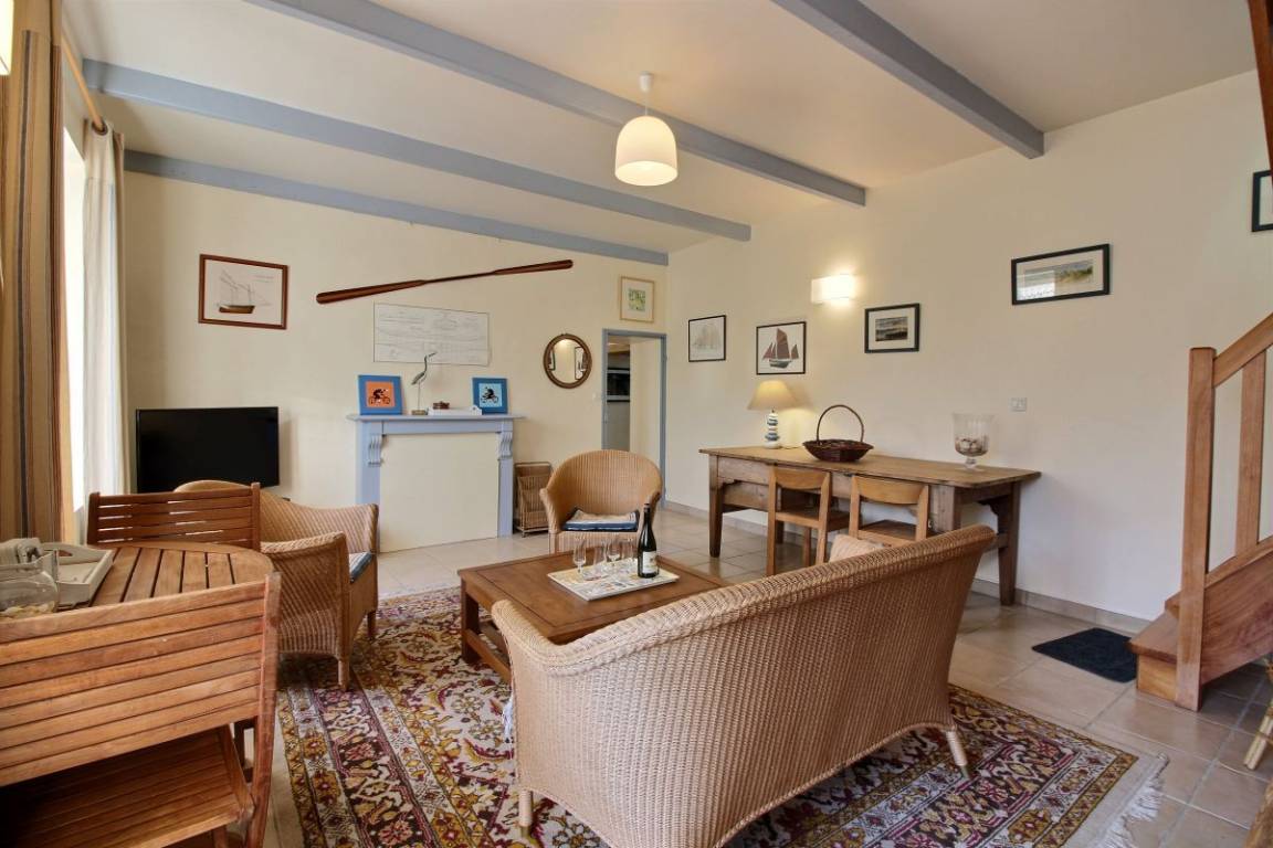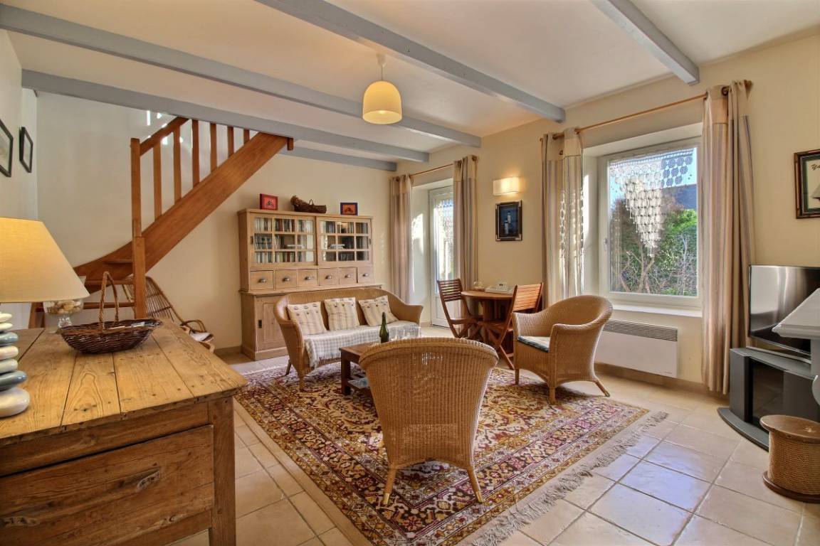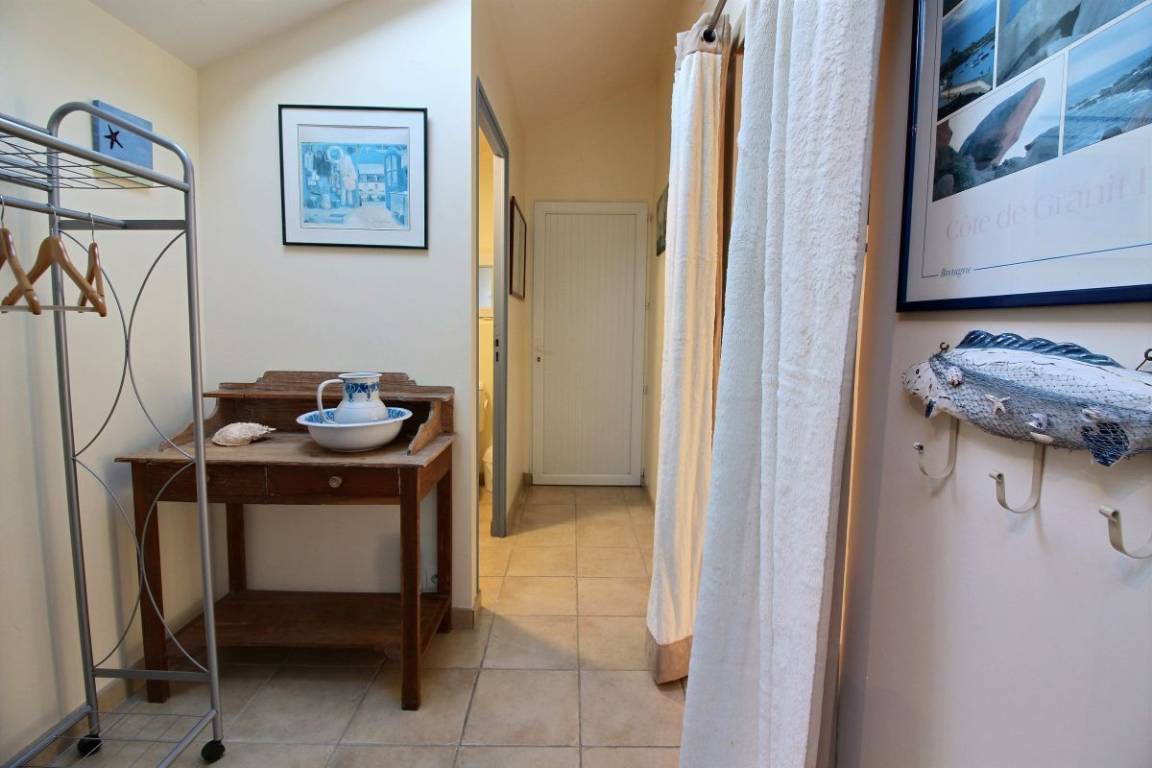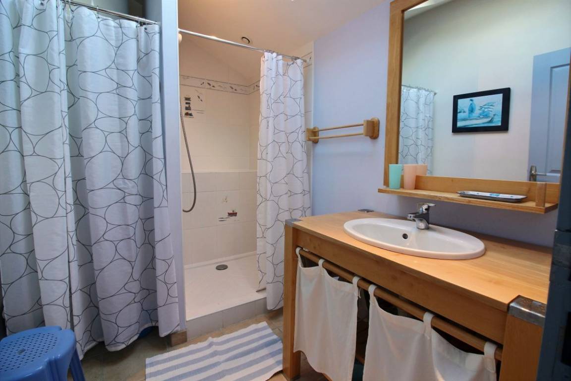 Diese Ferienwohnung umfasst : Im Erdgeschoss: Einbauküche, separates Wohnzimmer, Badezimmer mit Dusche, separates WC. Im Obergeschoss : 1 Zimmer (von der Küche aus zugänglich) für 1 Person (1 Einzelbett 90x190), 1 weiteres Zimmer (vom Wohnzimmer aus zugänglich) für 2 Personen (1 Bett 160x200). Gemeinsame Rasenfläche.