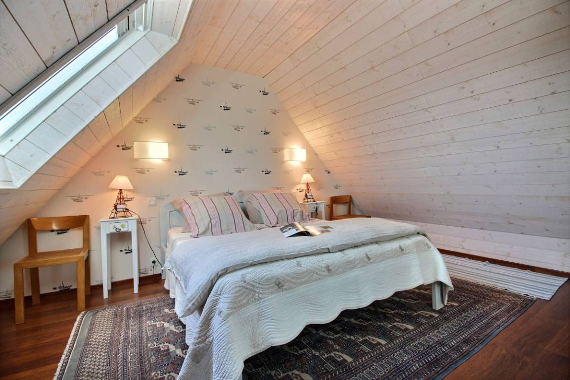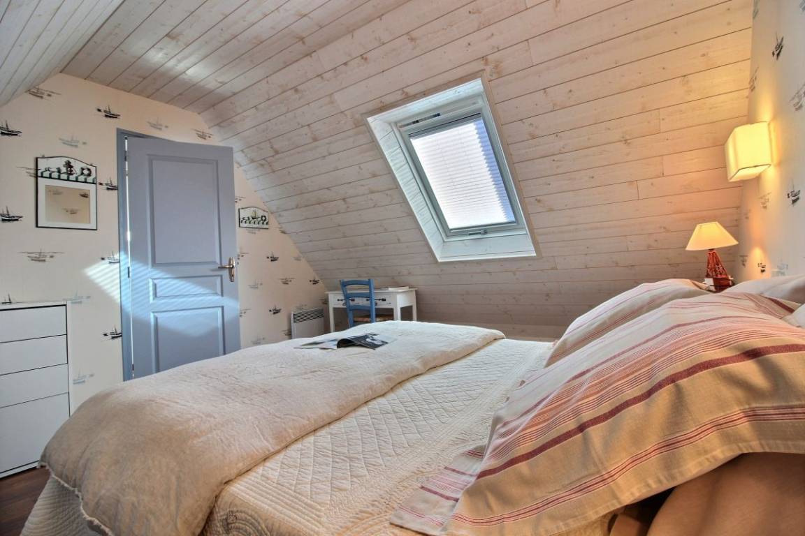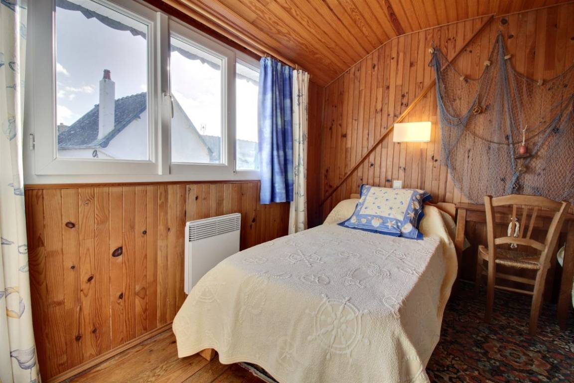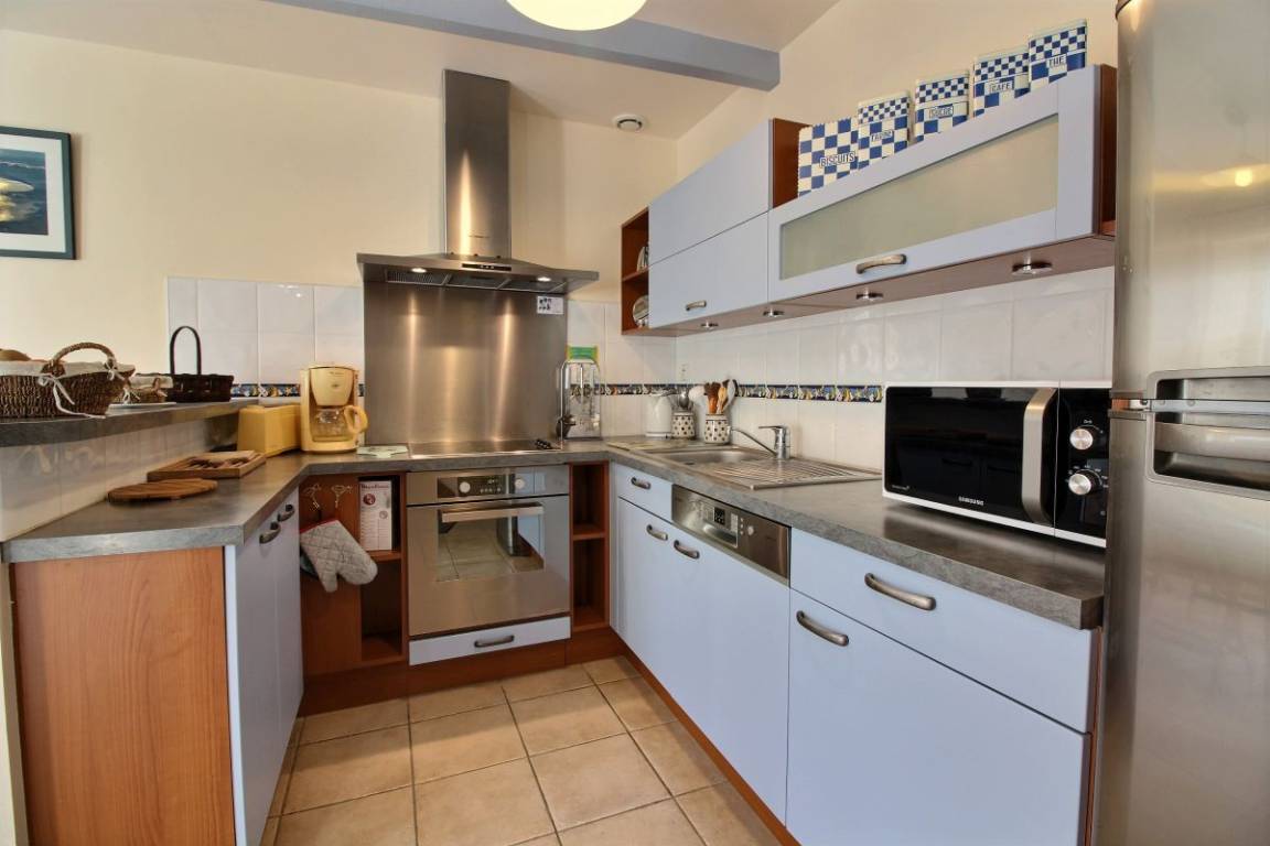 Diese Ferienwohnung umfasst : Im Erdgeschoss: Einbauküche, separates Wohnzimmer, Badezimmer mit Dusche, separates WC. Im Obergeschoss : 1 Zimmer (von der Küche aus zugänglich) für 1 Person (1 Einzelbett 90x190), 1 weiteres Zimmer (vom Wohnzimmer aus zugänglich) für 2 Personen (1 Bett 160x200). Gemeinsame Rasenfläche.