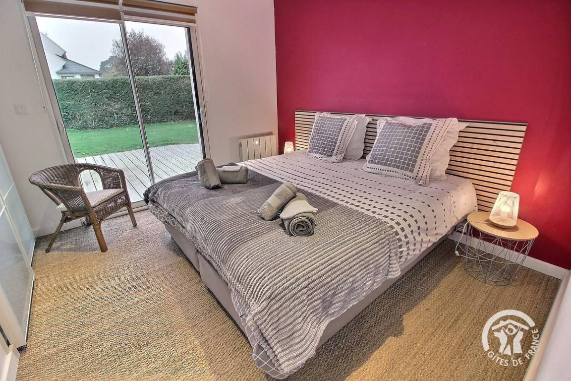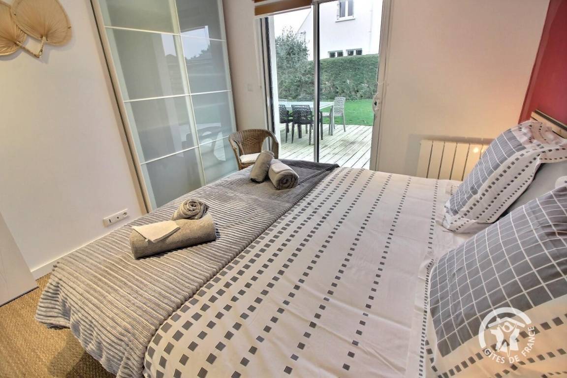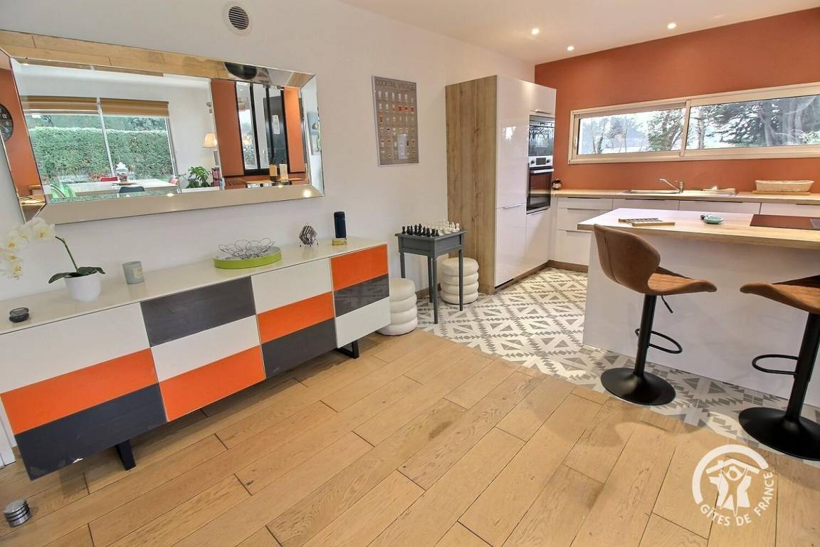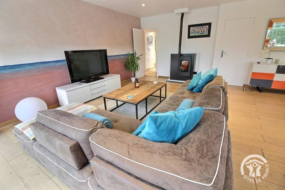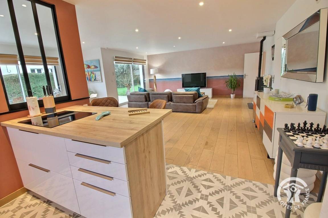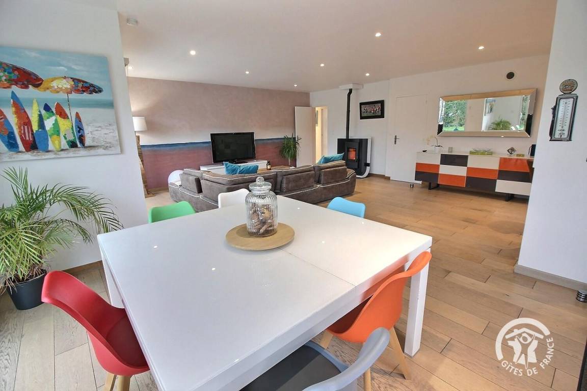 Ihre Ferienwohnung umfasst auf einer Ebene: ein großes Wohnzimmer mit Pelletofen (mitgeliefert) und Küchenbereich, eine Master-Suite (1 Schlafzimmer mit 1 180x200-Bett - das geteilt werden kann - mit TV, ein Ankleidezimmer, das zu seinem Badezimmer führt, Wasser -Dusche, Waschbecken-), ein Schlafzimmer (1 Bett 180x200 - teilbar-), ein Schlafzimmer (2 Betten 90x200 - trennbar-), ein großes Badezimmer mit Dusche und Waschbecken, eine Toilette mit Waschbecken, eine Waschküche /Abstellraum, eine angrenzende Garage (Fahrzeug, Motorrad(er), Ausrüstung etc.). Viele Spiele vor Ort (Tischtennisplatte, Badminton-Kit, ...). Lesungen und Gesellschaftsspiele für alle. Komplette Babyausstattung vor Ort. Ihr Mietobjekt ist nach Südwesten ausgerichtet, was Ihnen tagsüber und abends ein schönes Licht ermöglicht. 400 m² eingezäunter Garten, der das Haus umgibt, mit nach Westen ausgerichteter Holzterrasse von 80 m² und Innenhof von 120 m², bequem zum Parken.