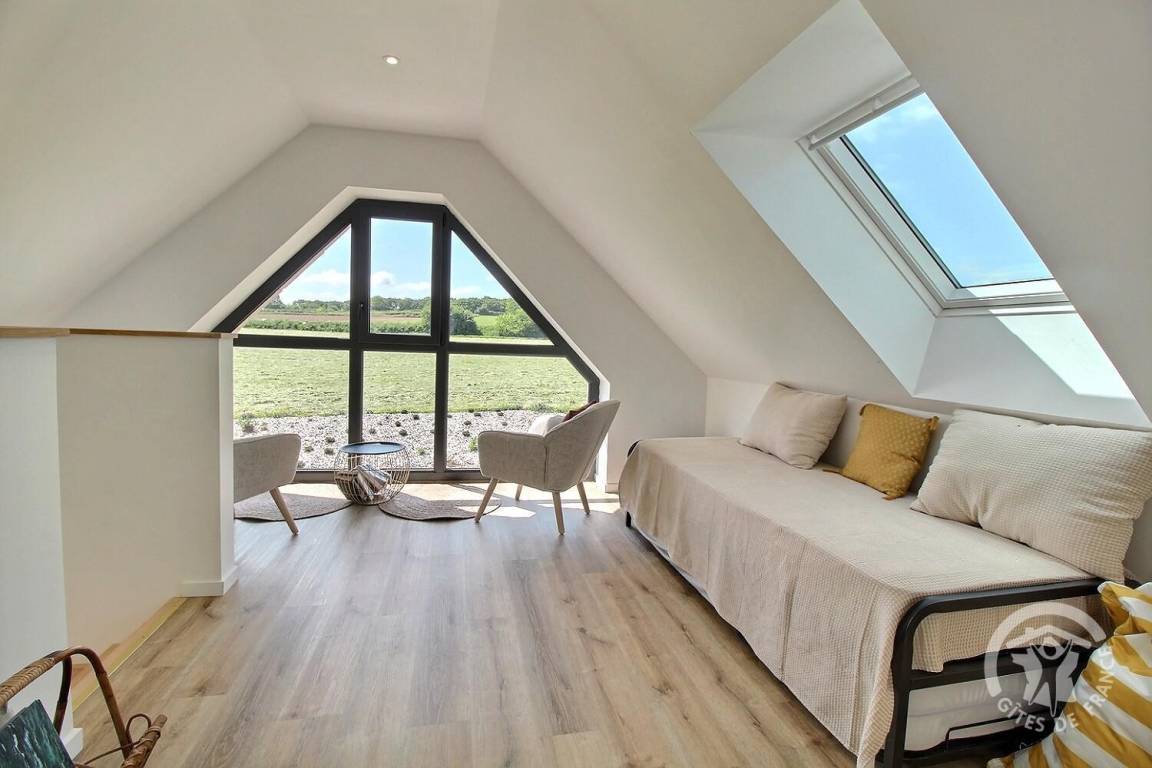Sehr helles Wohnzimmer im Zwischengeschoss, 1 Schlafzimmer mit eigenem Badezimmer (Dusche und Toilette) (2 90x200-Betten, die zusammengestellt werden können).