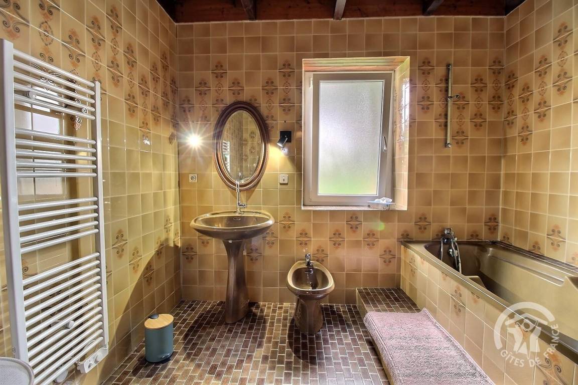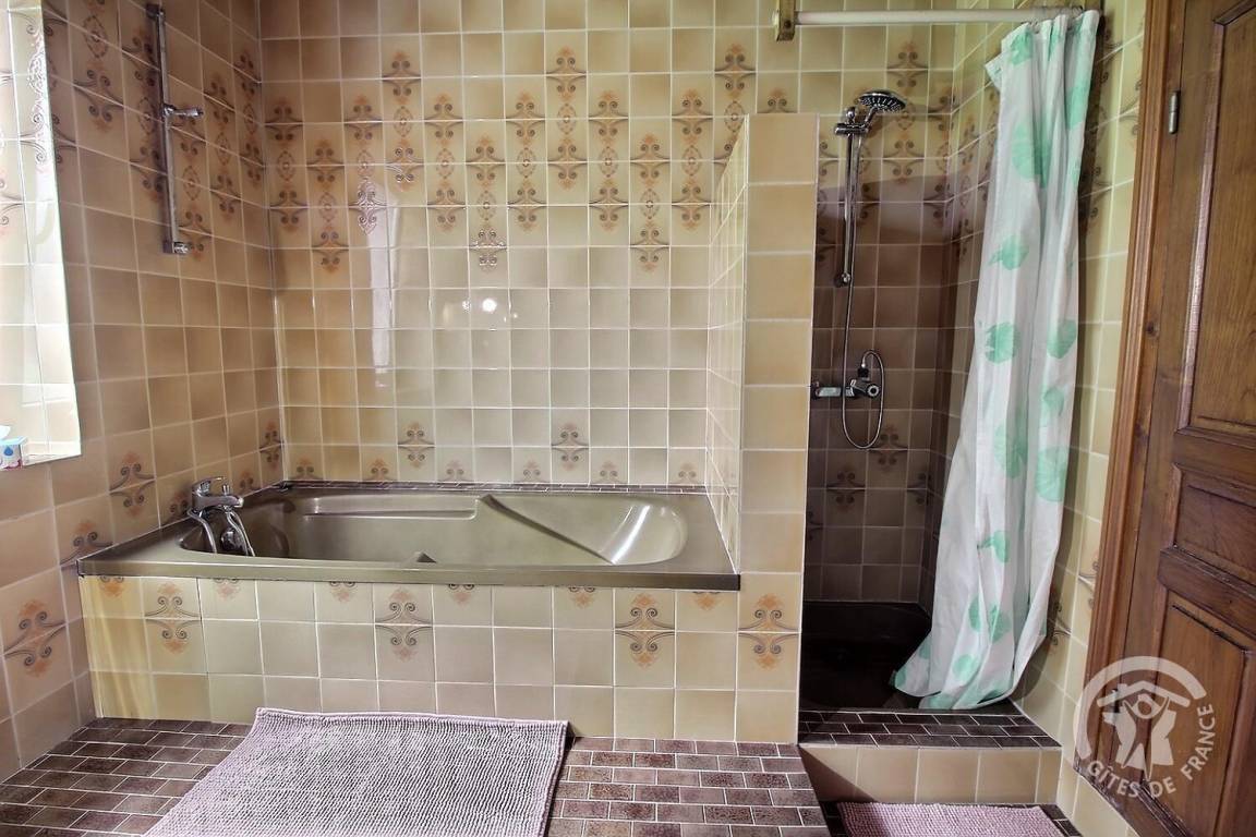 Sehr komfortabler Gite mit abgeschlossener Grünfläche, Südlage, einzelstehend. Erdgeschoss: Esszimmer mit eingebauter Küche, 1 Schlaf-Zi. (1 Doppelbett, 1 Einzelbett (1,10m)), Bade-Zi. (Badewanne, Dusche), WC. Etage: 1 Zwischenstock (1 Doppelbett), 1 Schlaf-Zi. (2 Einzelbetten, 1 Kinderbett). 1 km bis guten Einkaufsmöglichkeiten.