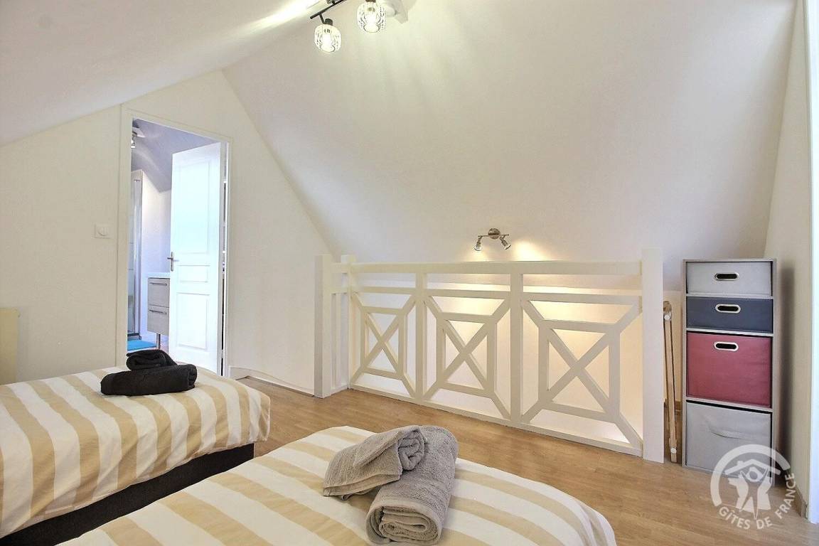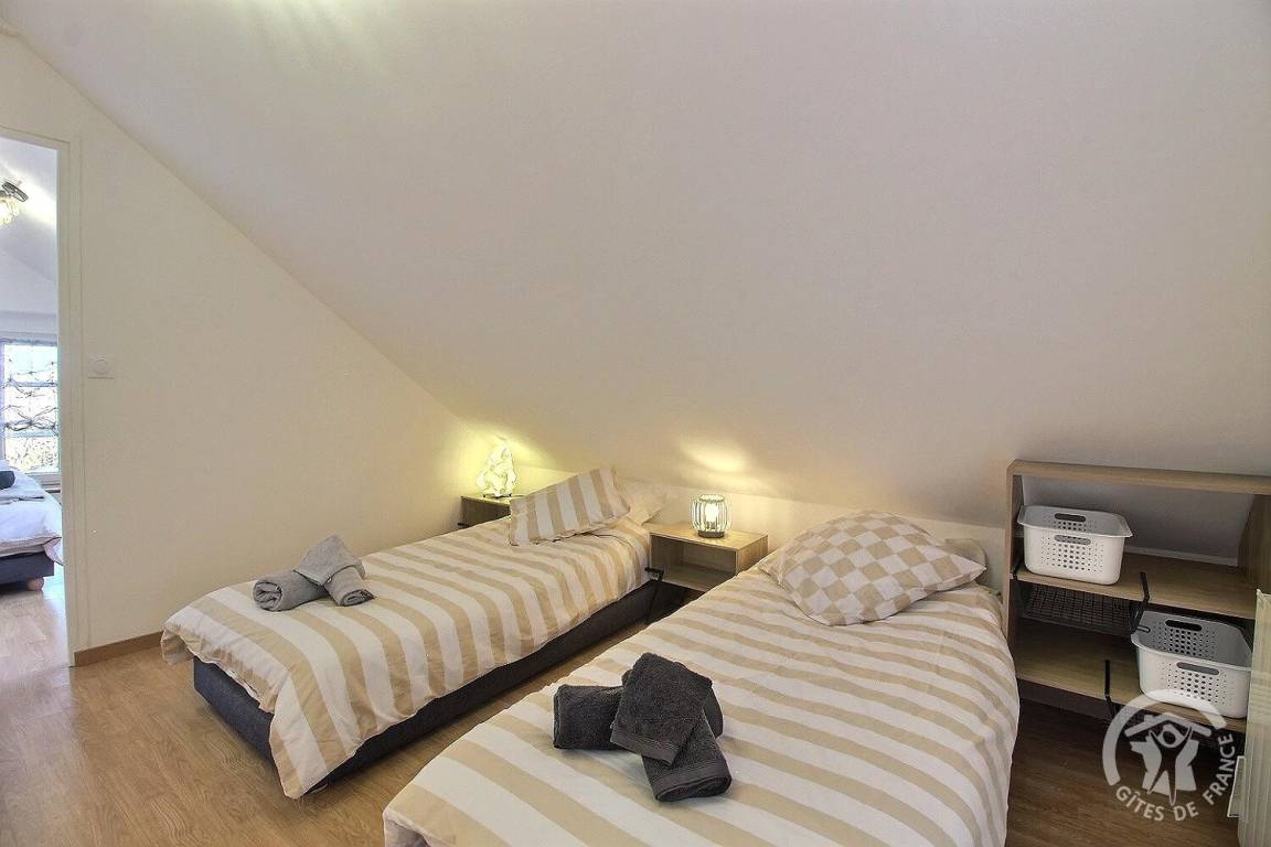 - ein Zwischengeschoss mit 2 Einzelbetten. 90x200 (kann nach vorheriger Anfrage bei den Eigentümern zu einem Bett 180x200 kombiniert werden, wie auf den Fotos)