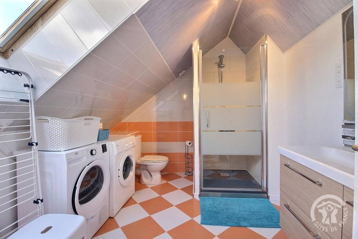 - ein großes Badezimmer mit Dusche, Waschbecken, Toilette und Waschküche,