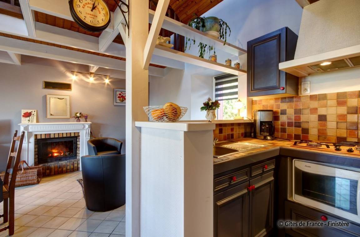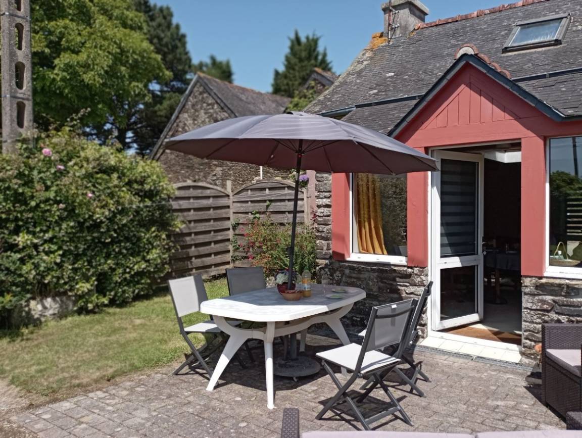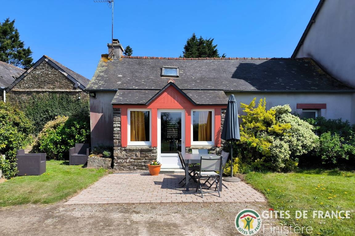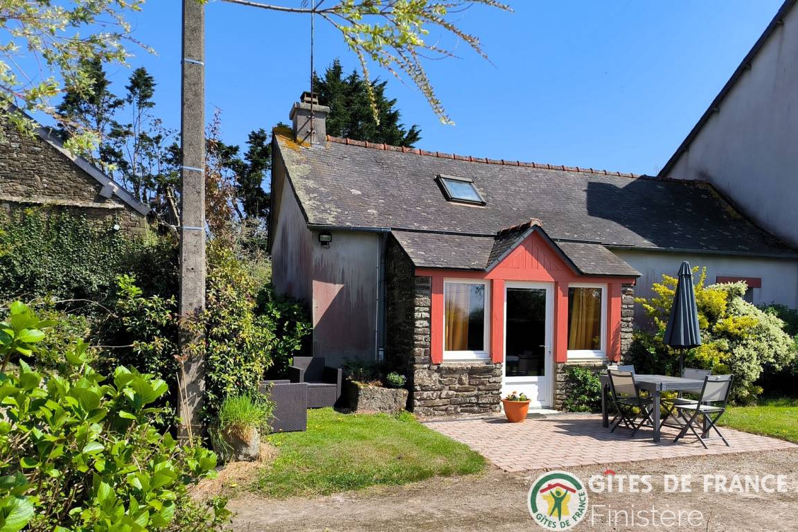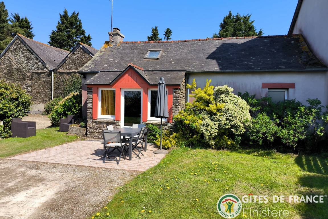 Haus grenzt an ein anderes Haus auf einem Bauernhof. EG: Wohnraum mit Kochecke + Kaminofen, Bad, sep. WC, Doppelzimmer. 1 Stock: Zweibettzi., Loggia, Waschraum mit Waschbecken, sep. WC. Heizung. Garten, Gartenmöbel. Gem. Spielplatz mit Schaukel. Dieser Gîte liegt im Naturschutzpark von Armorique mit zahlreichen Wanderwegen. Kanu: 5km.