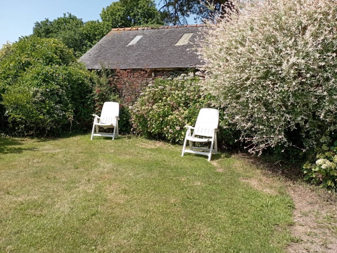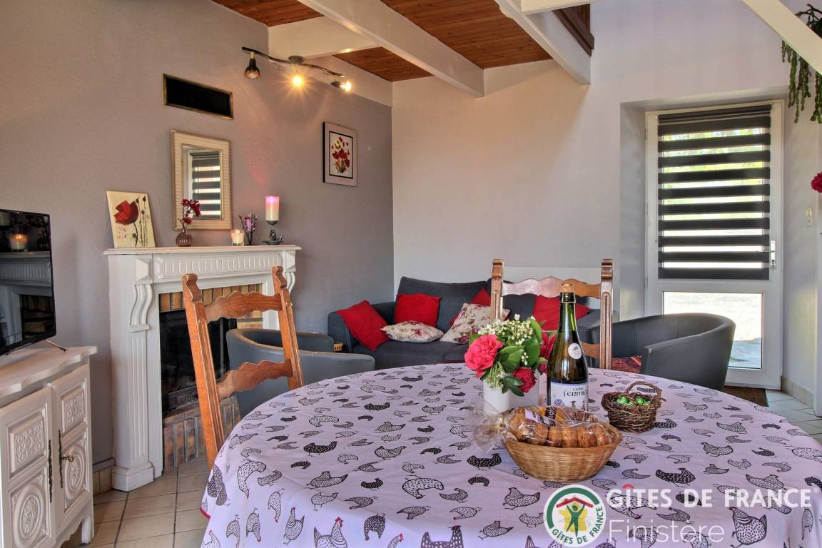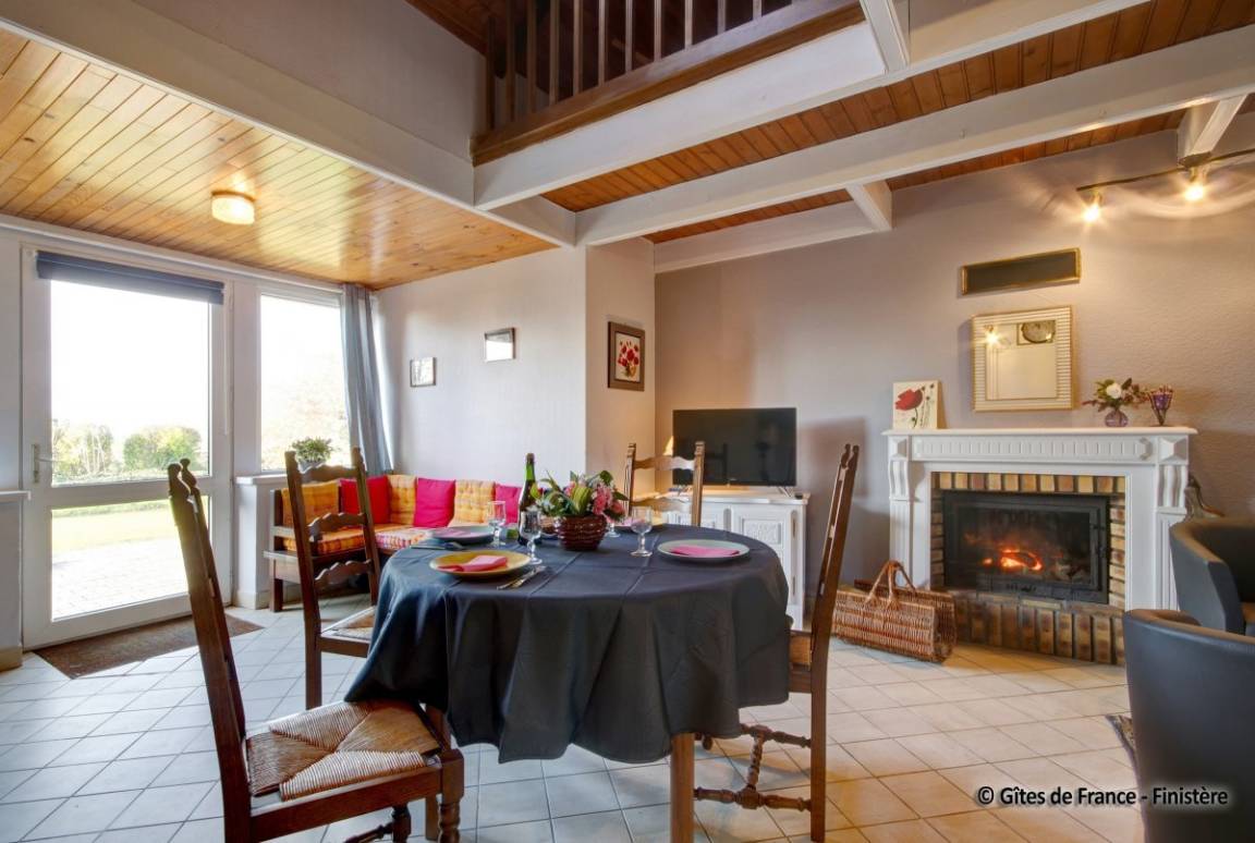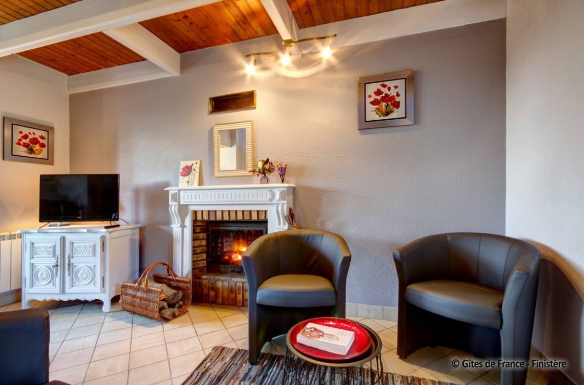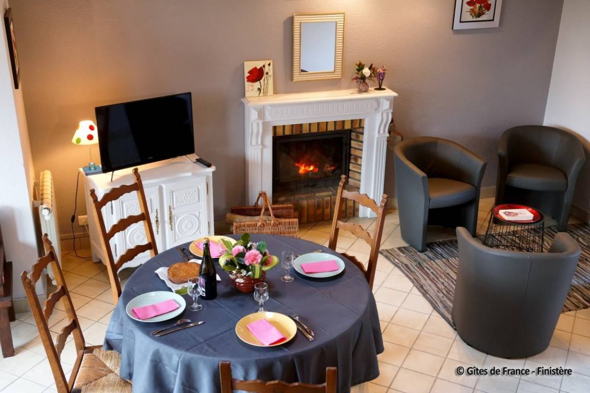 Haus grenzt an ein anderes Haus auf einem Bauernhof. EG: Wohnraum mit Kochecke + Kaminofen, Bad, sep. WC, Doppelzimmer. 1 Stock: Zweibettzi., Loggia, Waschraum mit Waschbecken, sep. WC. Heizung. Garten, Gartenmöbel. Gem. Spielplatz mit Schaukel. Dieser Gîte liegt im Naturschutzpark von Armorique mit zahlreichen Wanderwegen. Kanu: 5km.