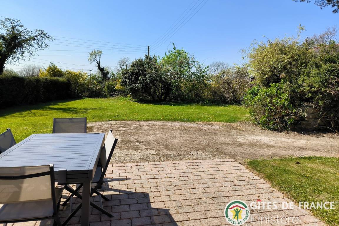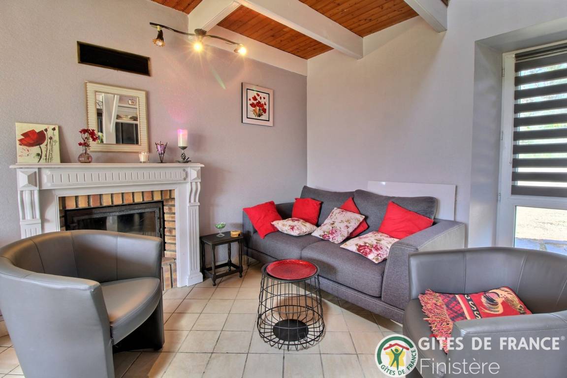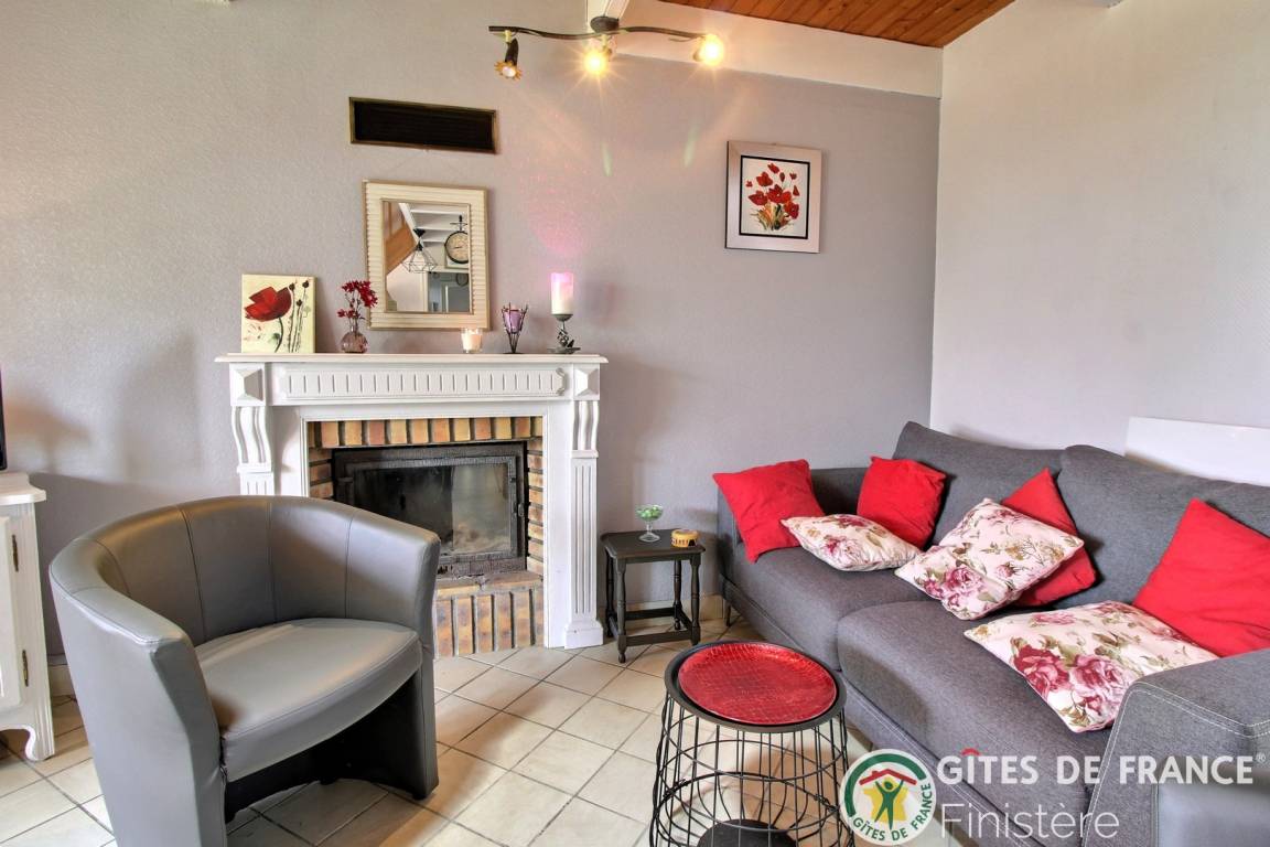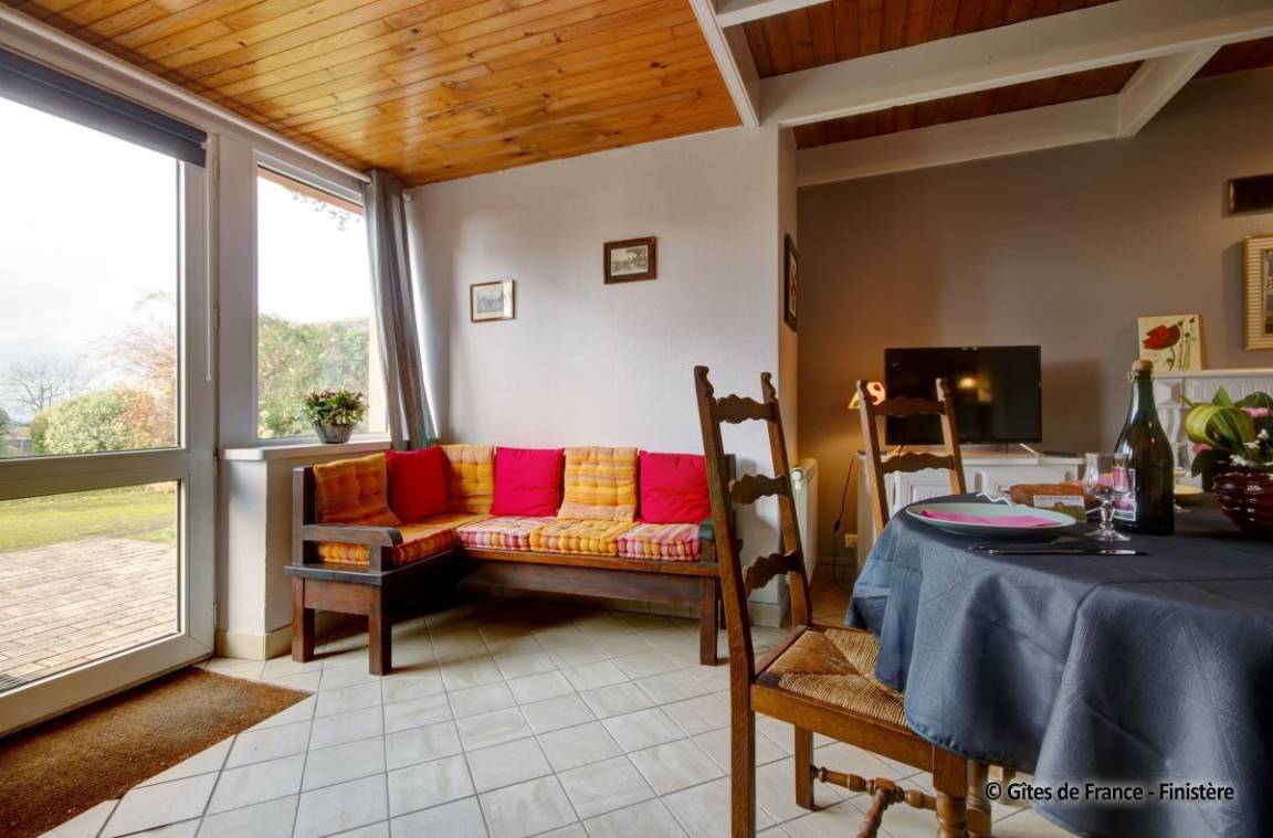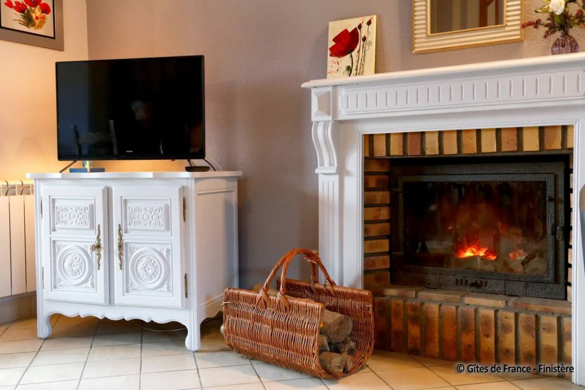 Haus grenzt an ein anderes Haus auf einem Bauernhof. EG: Wohnraum mit Kochecke + Kaminofen, Bad, sep. WC, Doppelzimmer. 1 Stock: Zweibettzi., Loggia, Waschraum mit Waschbecken, sep. WC. Heizung. Garten, Gartenmöbel. Gem. Spielplatz mit Schaukel. Dieser Gîte liegt im Naturschutzpark von Armorique mit zahlreichen Wanderwegen. Kanu: 5km.