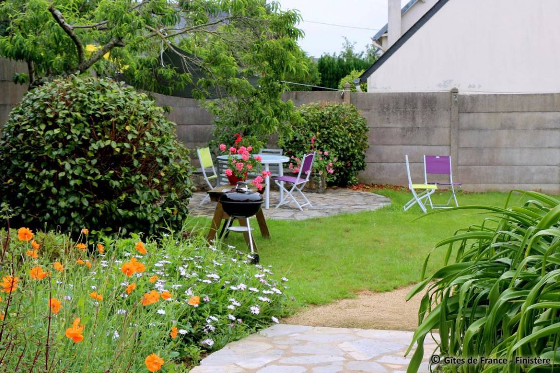 Haus mit umzäuntem blumenreichem Garten im Zentrum Pleyben. EG : Ess-Wohnraum, Küche, Veranda, Doppelbettzimmer mit franz. Doppelbett, Dusche, WC, En-Suite Einzelzimmer mit Dusche/WC, Vorratskammer. 1. Stock : grosses Doppelbettzimmer (Bettbreite 160cm) mit Sitzecke, Einzelzimmer, Dusche/WC. Ölzentralheizung, Wi-Fi. Umzaünter Garten, Gartenmöbel, Parkplatz, Grill, überdachter Platz.