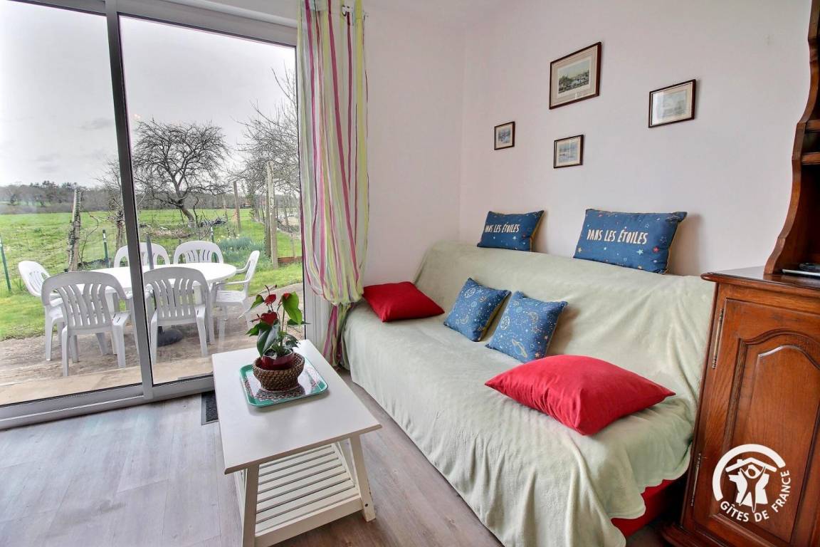 - Wohnzimmer mit Schlafsofa und direktem Zugang nach draußen.