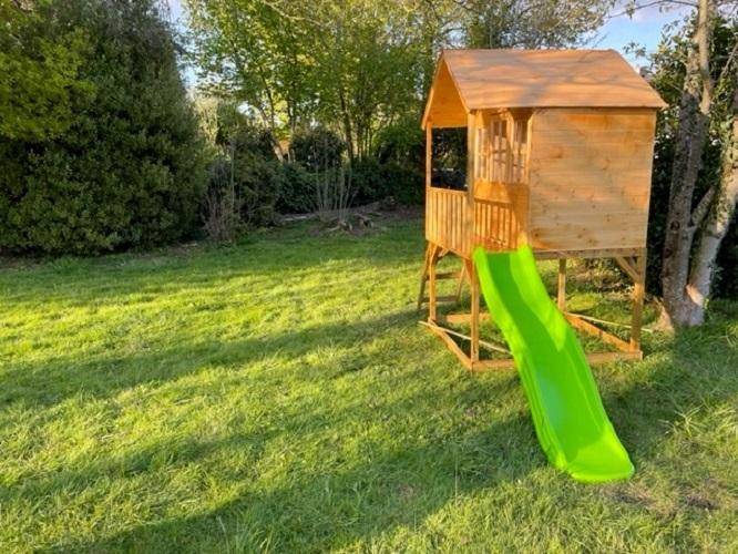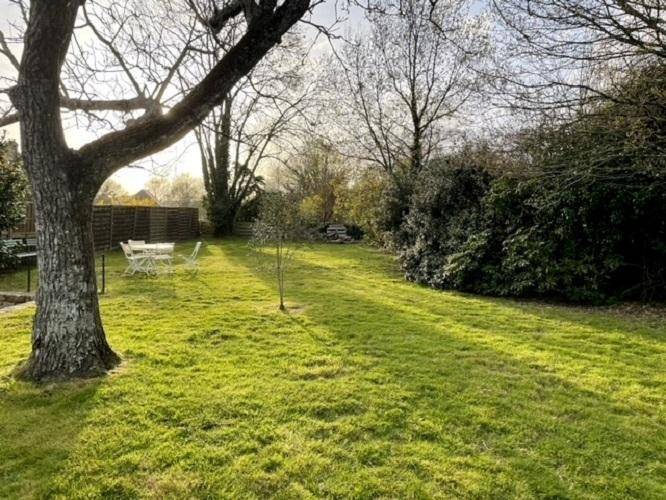 Eingezäunter Garten von 400 m² mit Esstisch, Grill-Sonnenschirm und Holzhütte für Kinder. Dank eines Tors besteht die Möglichkeit, 2 Fahrzeuge auf dem sicheren Grundstück zu parken. Garage zur Aufbewahrung von Sportgeräten vorhanden.
