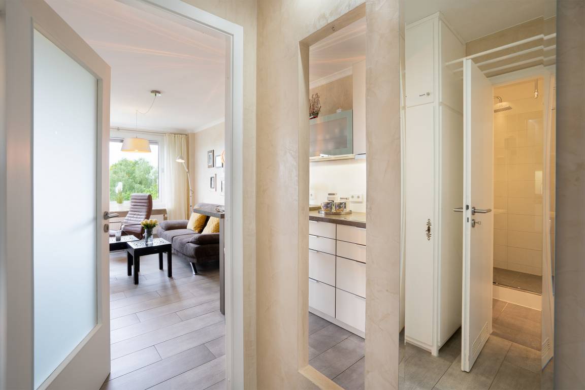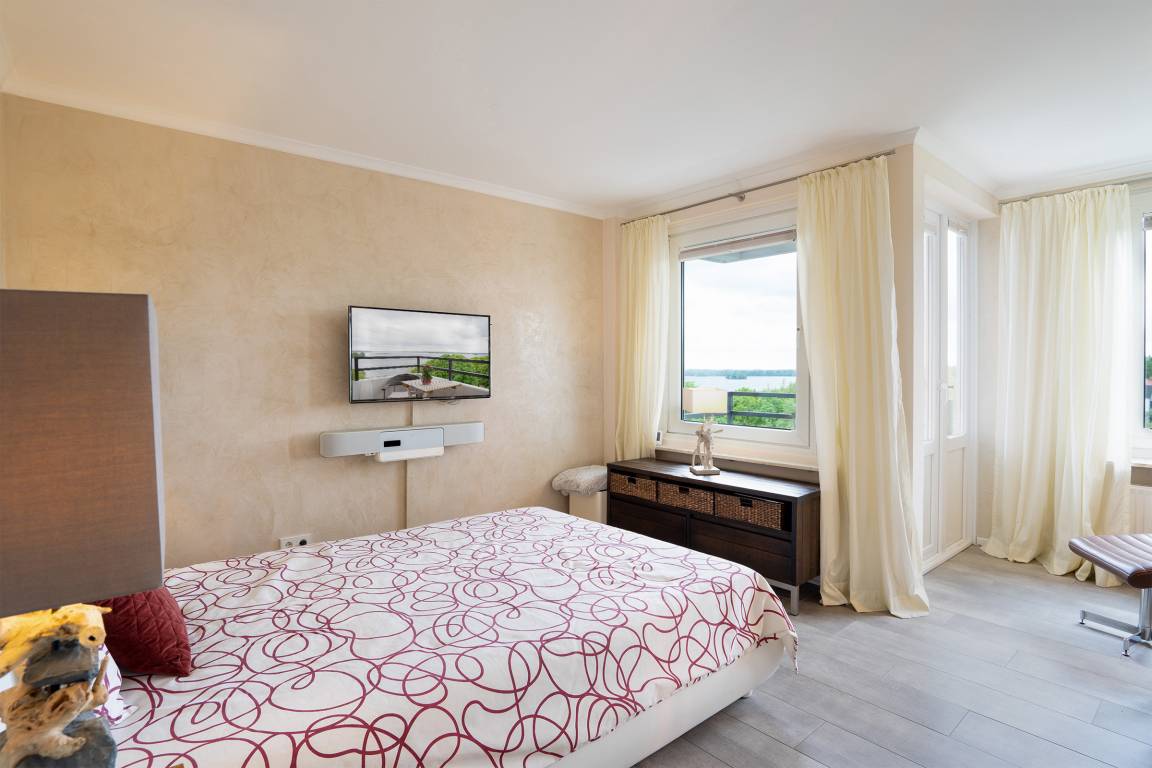 Das Apartment liegt im 5. Stock eines Hauses in der Ölmühlenallee, direkt am Großen Plöner See. Es verfügt über ein Wohn‑/Schlafzimmer mit großen Panoramafenstern, eine hochwertig ausgestattete Küchenzeile mit Essplatz sowie ein modern saniertes Badezimmer mit Dusche und WC. Ein eigener Balkon eröffnet einen wunderbaren Blick auf den See.