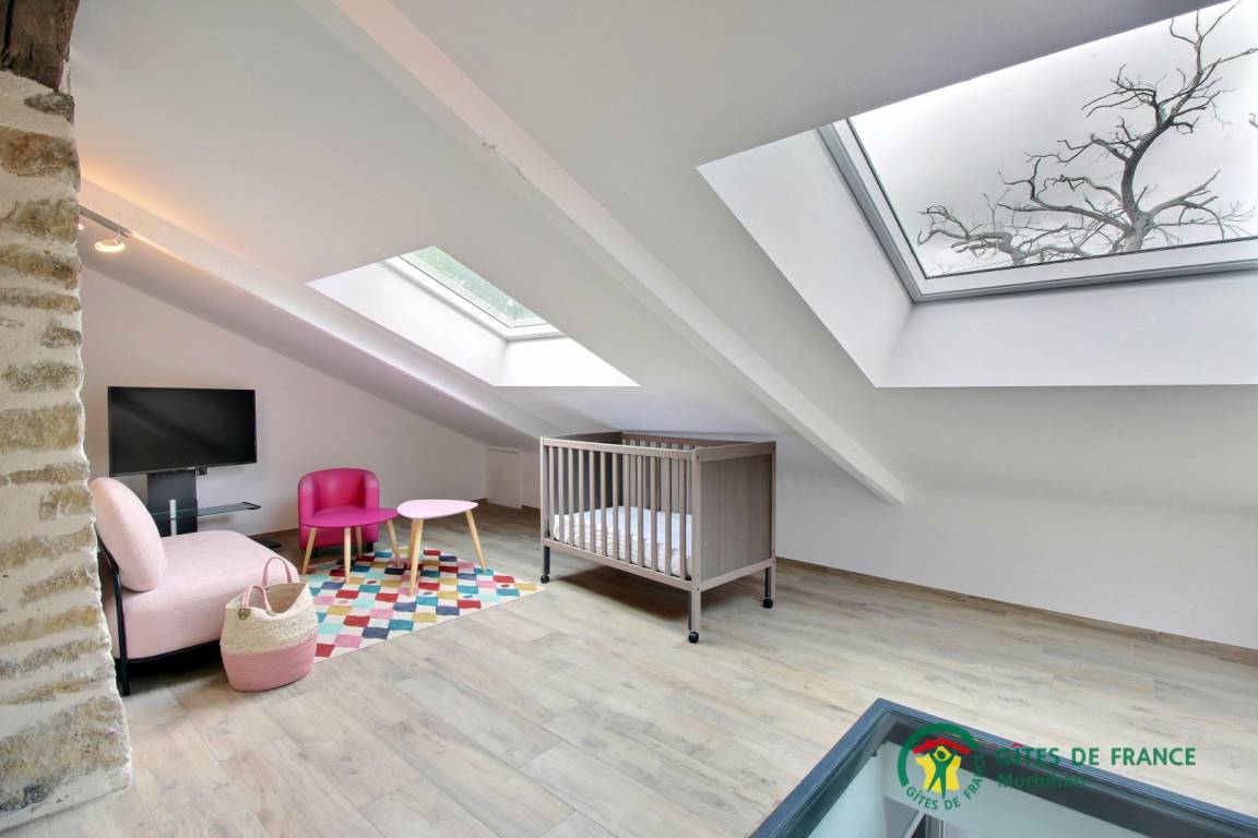 - Im ersten Stock: ein zum Wohnzimmer umgebautes Zwischengeschoss mit Fernseher und Spielbereich, ein Schlafzimmer (2 Einzelbetten), ein Badezimmer und ein separates WC.