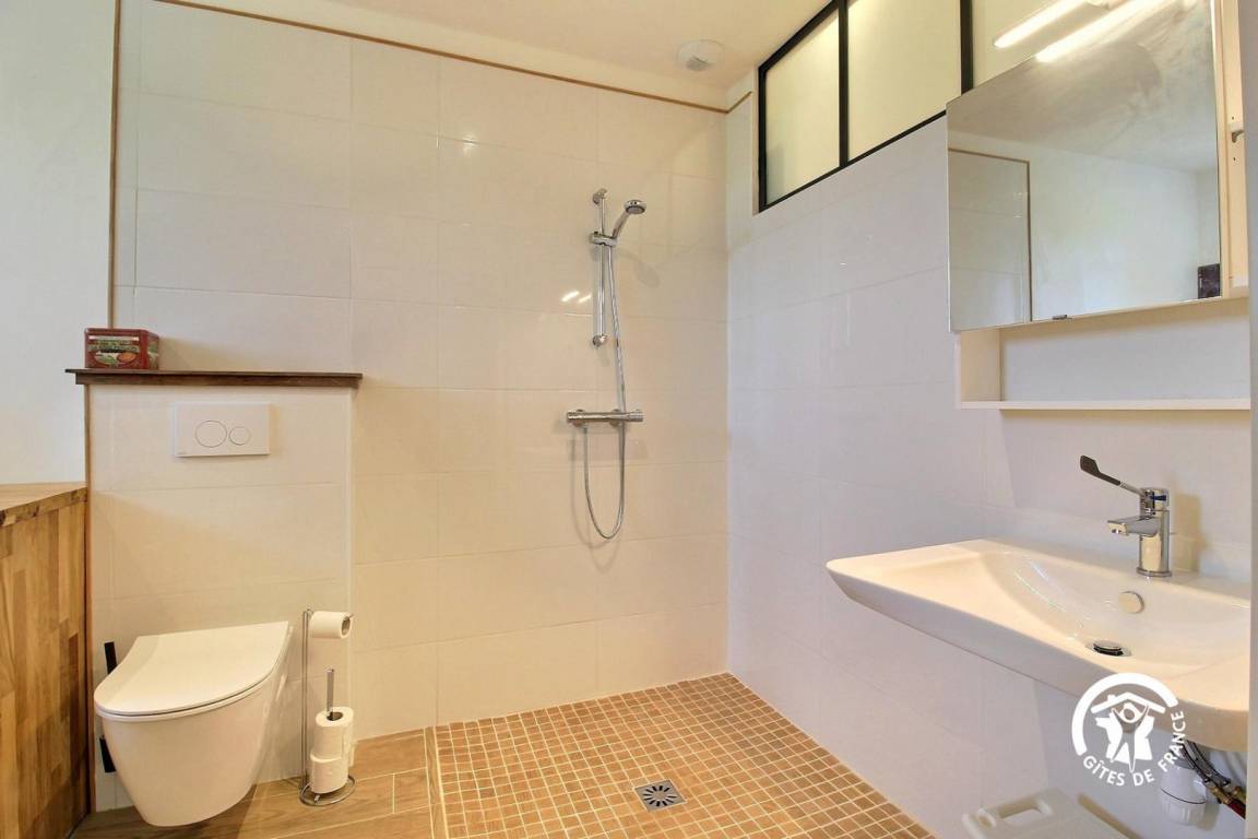 - Ein Badezimmer mit ebenerdiger Dusche und WC.