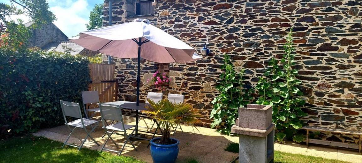Gîte, der an einen weiteren Gîte grenzt, im Dorf von Ploëven. EG: Wohnraum mit Kochecke und Kamin (Holzofen), sep. WC, Waschbecken. 1.Stock: Doppelzimmer mit Babybett, Zweibettzi., Einzelzi., Dusche, sep. WC. E-Heizung. Terrasse. Umzäunter, abgeschlossener Garten (Sträucher und Gitter), Gartenmöbel, Grill, eigener Parkplatz.