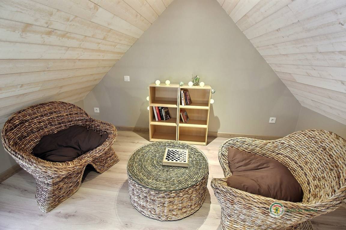 Ihre ebenerdige Ferienwohnung beinhaltet: Küche, Wohnzimmer und Sitzecke, Badezimmer mit Schiebetür (Dusche und WC), 1 Schlafzimmer mit Schiebetür und 1 Bett 140x190, eine kleine Leseecke, die über eine steile Treppe erreichbar ist. Vergnügungswiese von 80 m² und schöne Terrasse von 30 m². Gemeinsamer und privater Parkplatz für die 2 Ferienhäuser.