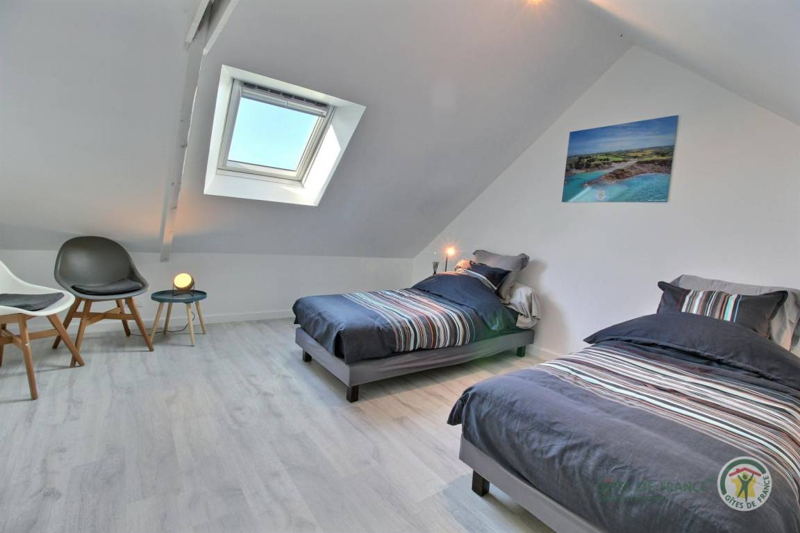 Im Obergeschoss befinden sich zwei Schlafzimmer (mit zwei Einzelbetten 90x190 cm und einem Doppelbett 160x200 cm), ein Badezimmer mit Badewanne und ein WC.