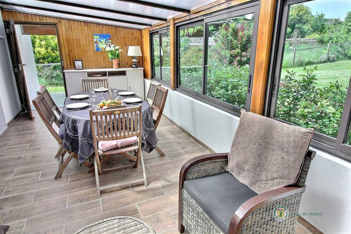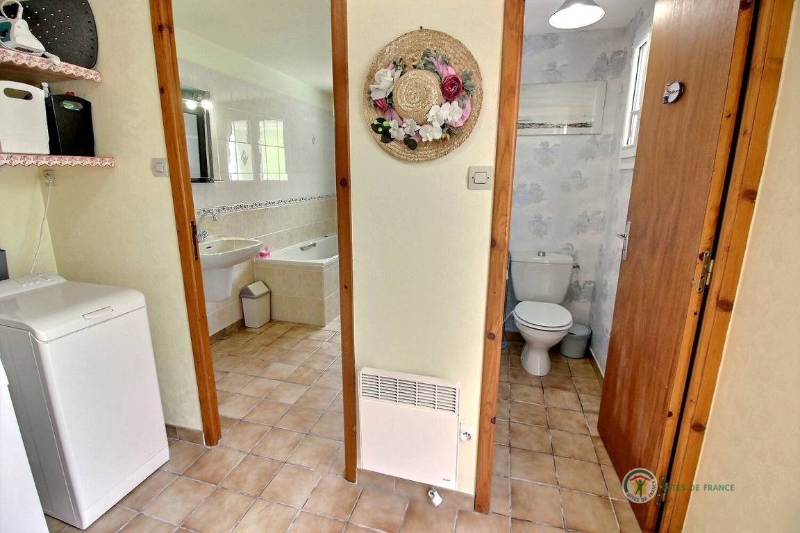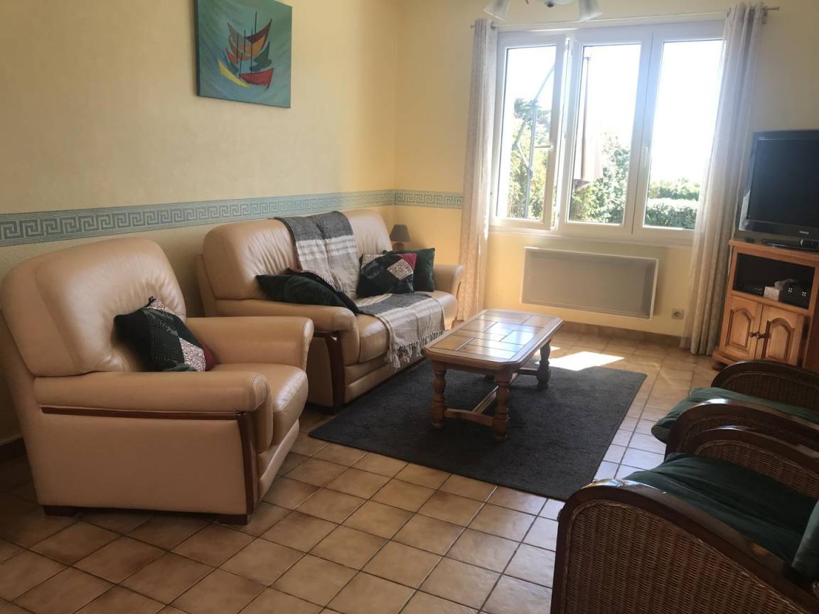 Ihre Ferienwohnung umfasst im Erdgeschoss: eine zum Wohnzimmer offene Küche, eine Waschküche mit Waschmaschine und Geschirrspüler, Badezimmer mit Badewanne und Dusche, separates WC, 1 Schlafzimmer mit 1 160x200-Bett. Etage: 2 Schlafzimmer mit 1 Bett 140x190 und 1 Bett 90x200. An der Vorderseite des Ferienhauses befindet sich eine 15 m² große Terrasse und Rasenfläche mit kleinem Meerblick und an der Rückseite eine schöne 19 m² große Veranda mit Blick auf eine große 400 m² große Rasenfläche, die auf der einen Seite von Hecken umgeben und auf der anderen Seite eingezäunt ist. Öffentlicher Parkplatz 50m entfernt.