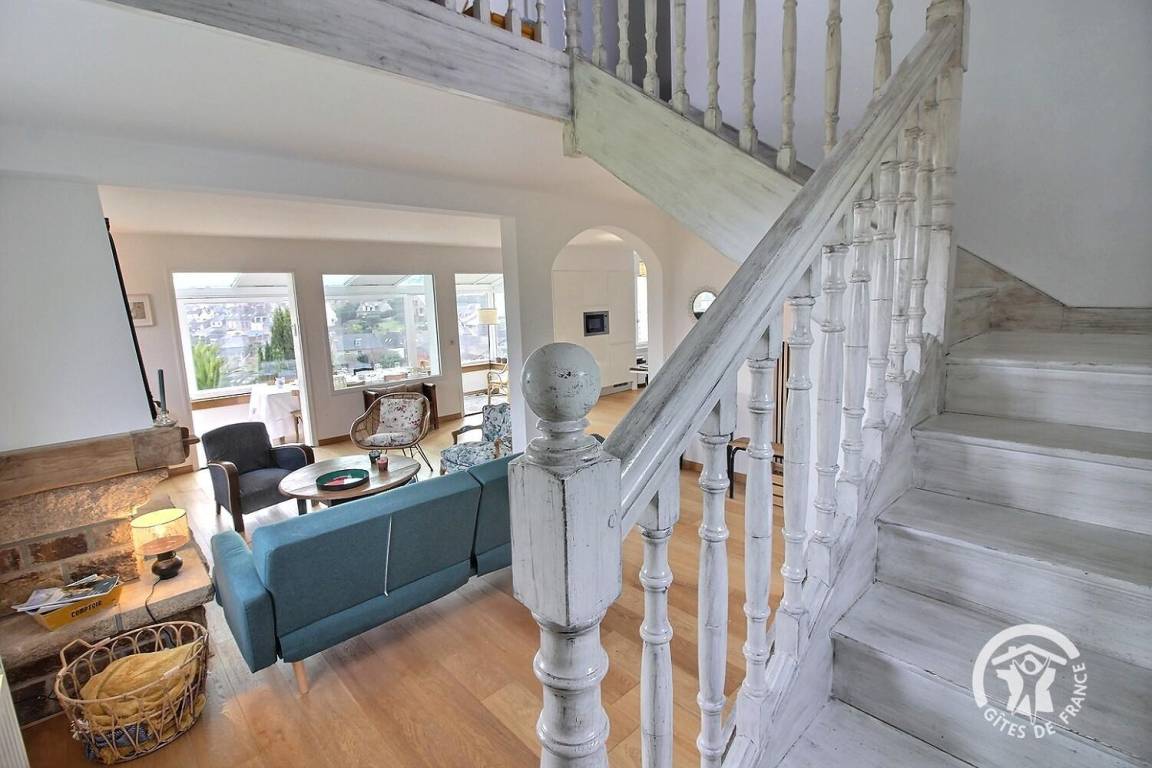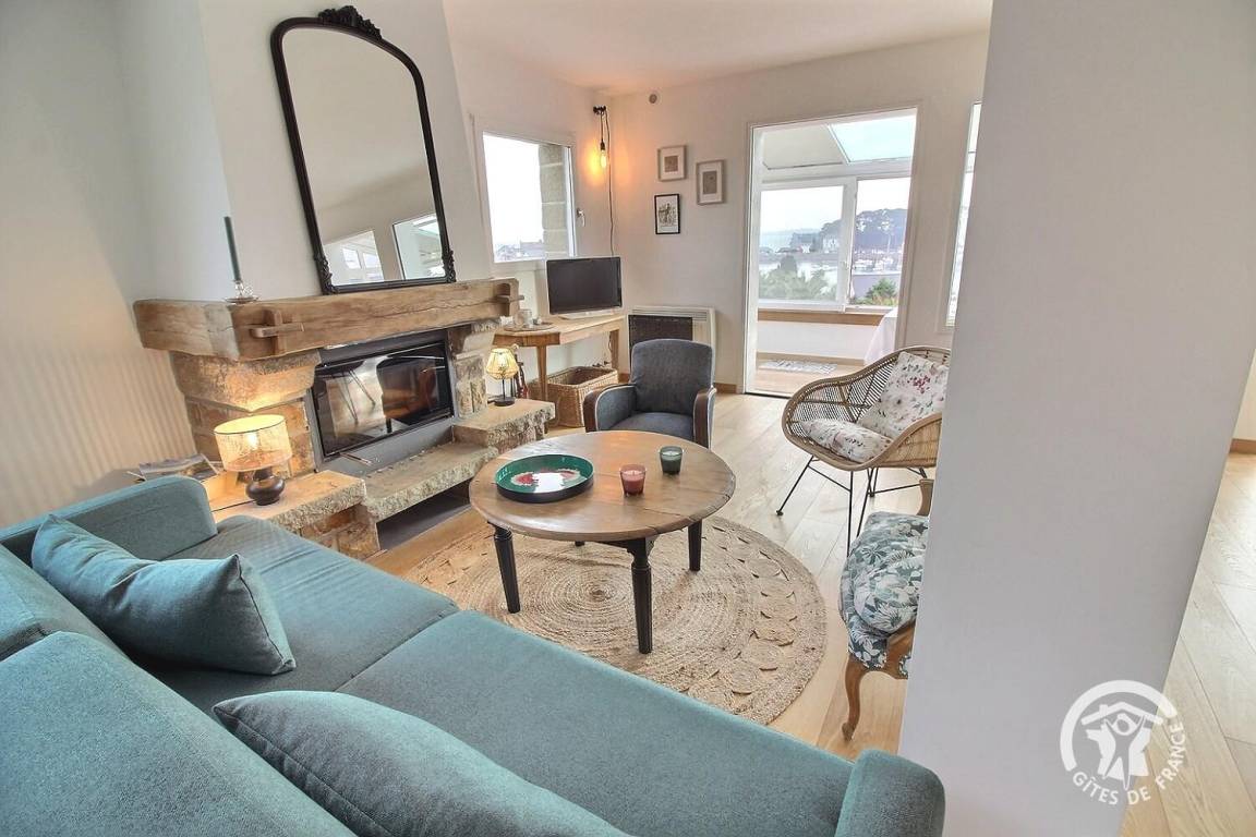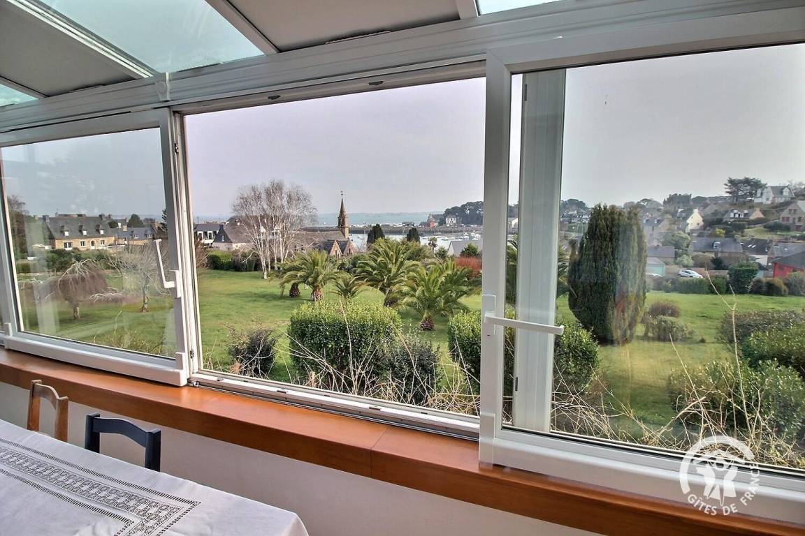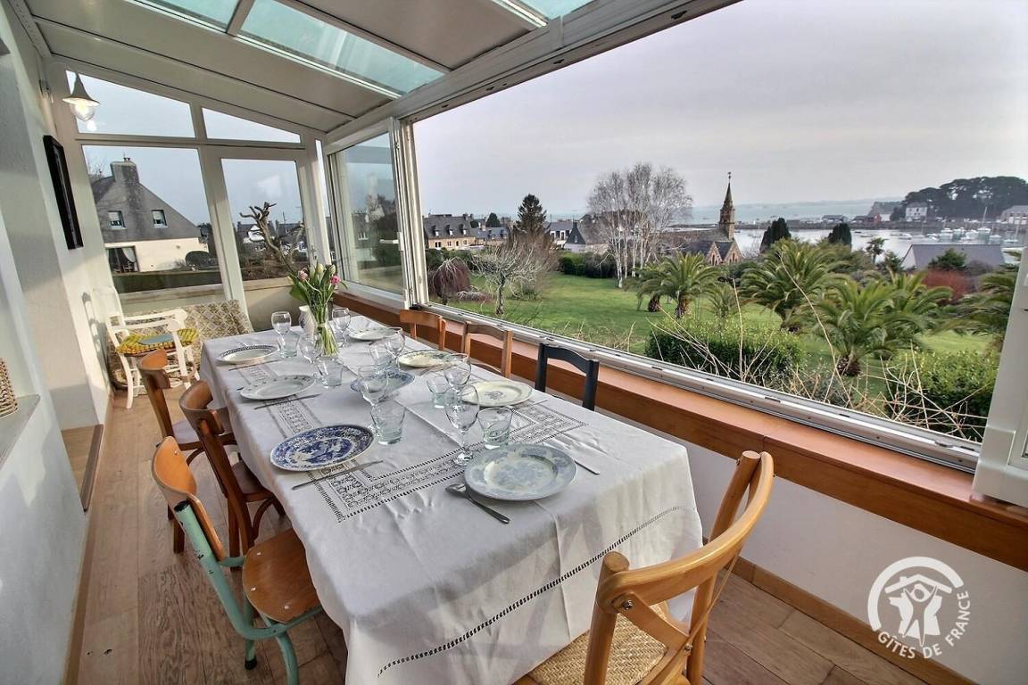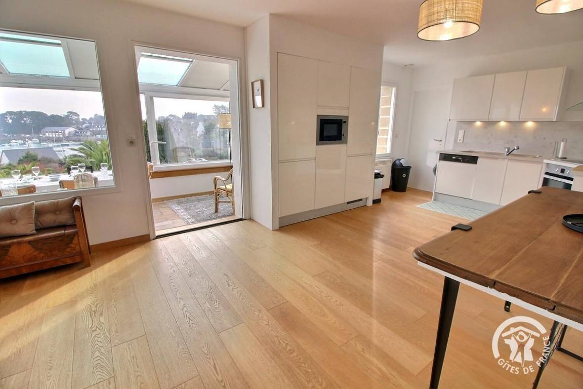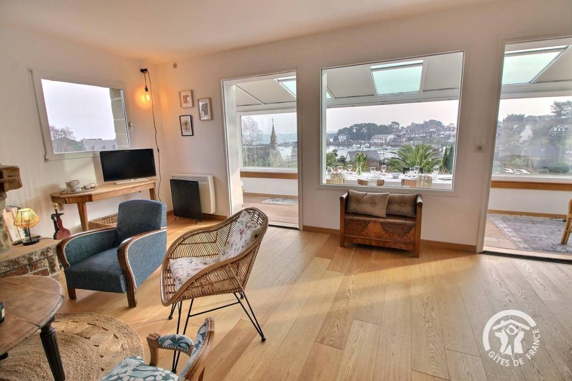 • Ein großer Wohnbereich mit einer voll ausgestatteten Einbauküche, einem Veranda-Wohnzimmer mit herrlichem Blick auf den Hafen von Loguivy und einer Lounge mit.