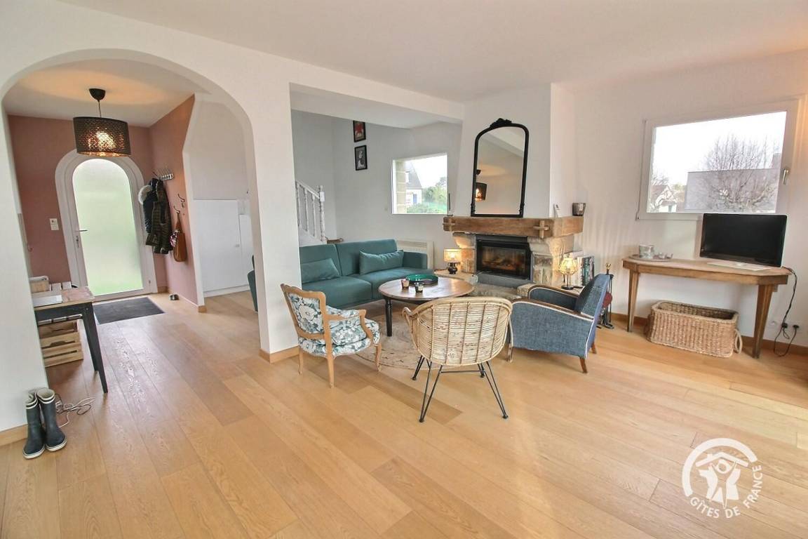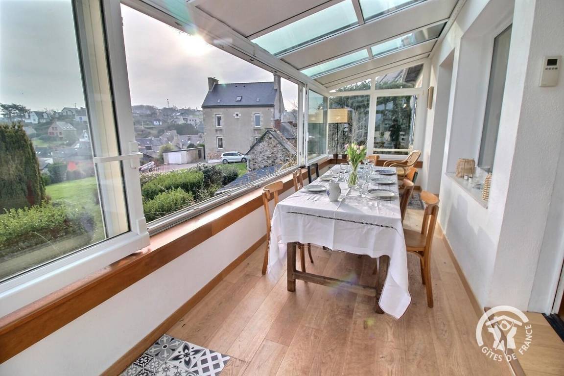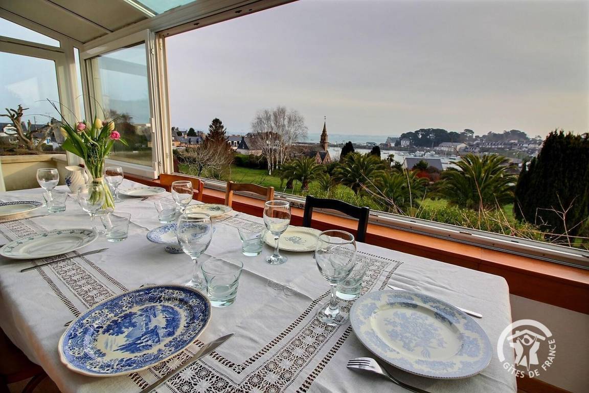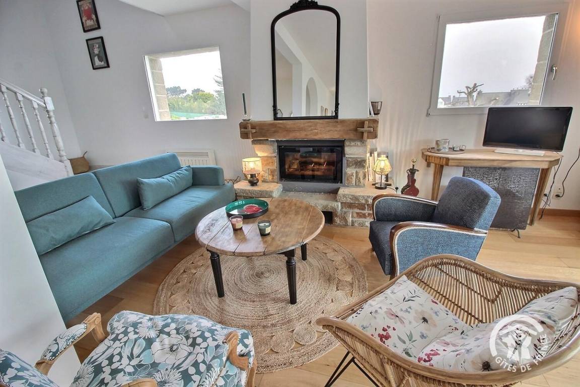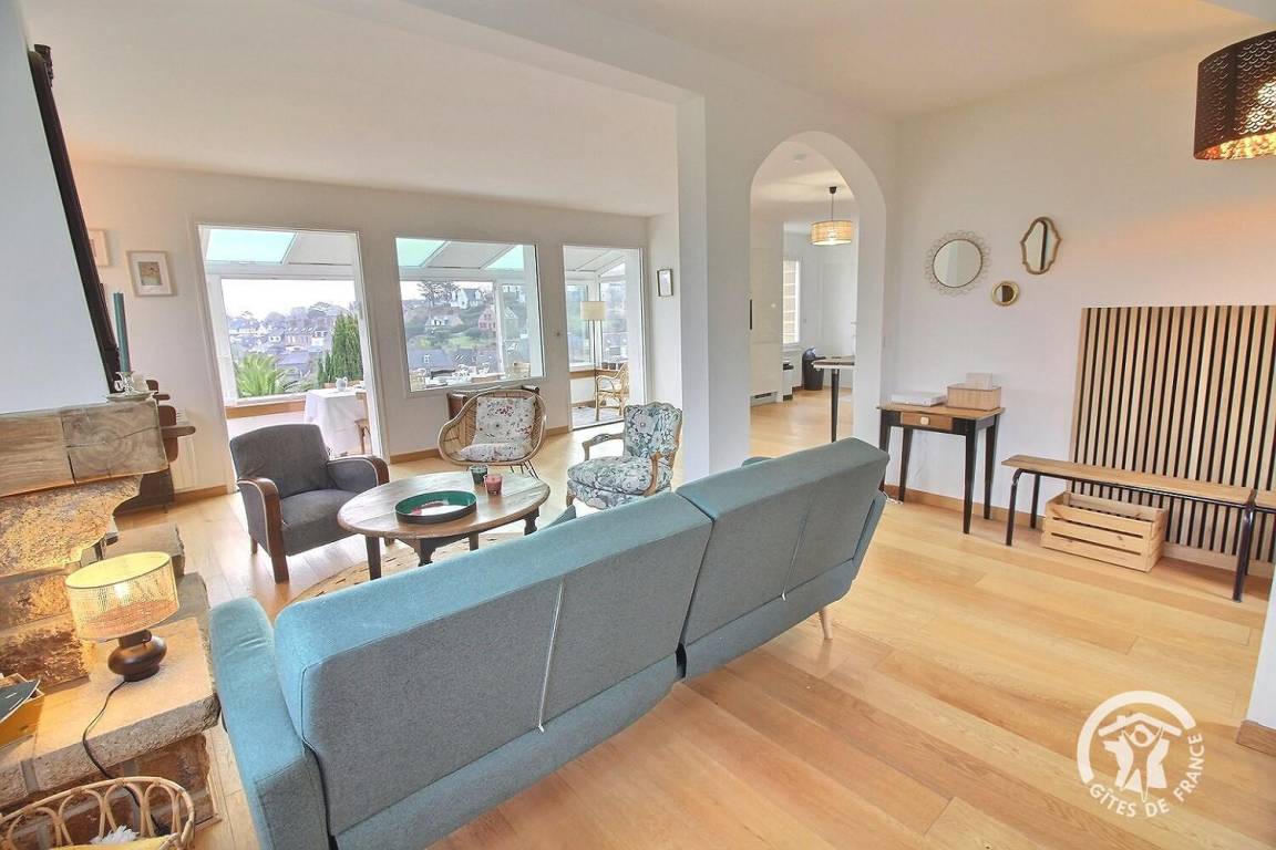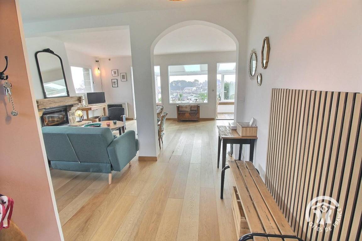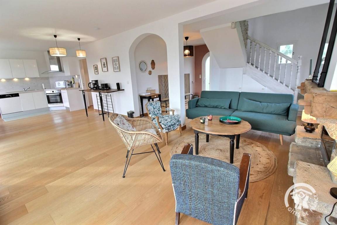 • Ein großer Wohnbereich mit einer voll ausgestatteten Einbauküche, einem Veranda-Wohnzimmer mit herrlichem Blick auf den Hafen von Loguivy und einer Lounge mit.