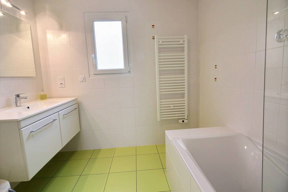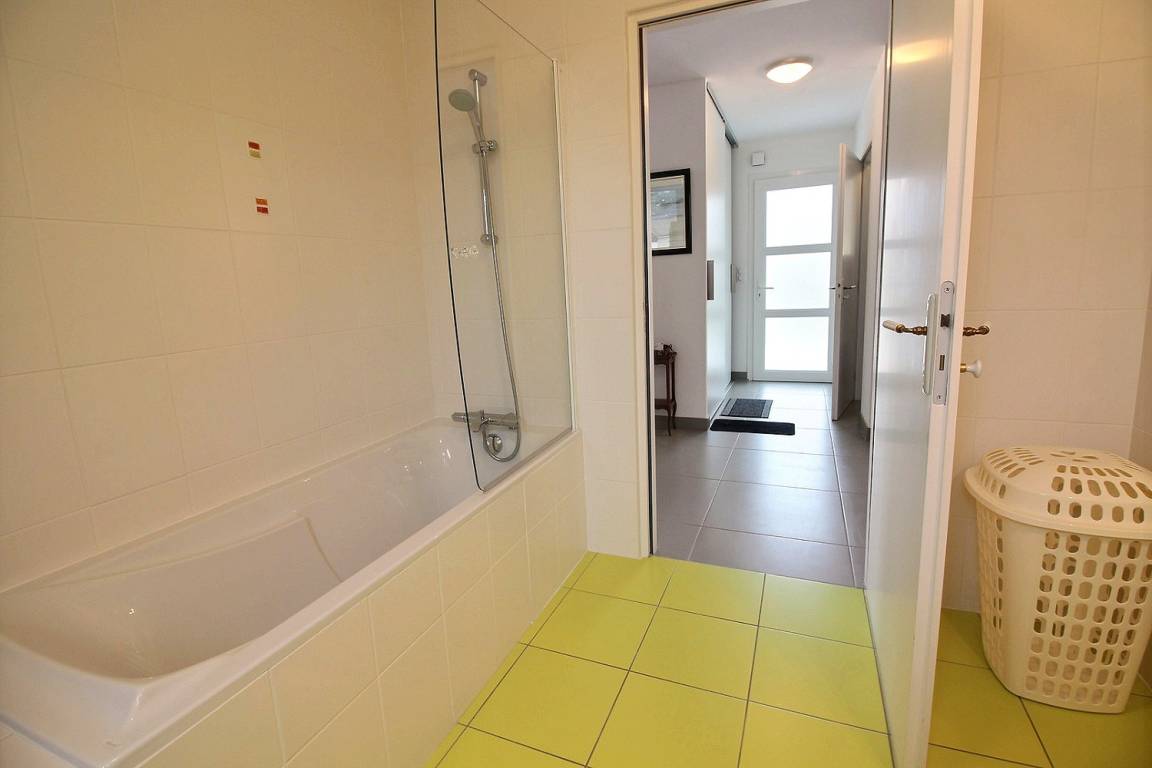 Ihre ebenerdige Ferienwohnung bietet Ihnen: ein elegant eingerichtetes Wohnzimmer mit viel Tageslicht dank großer Fensterfronten zur Terrasse; eine voll ausgestattete und funktionale Küche, die durch Schiebetüren vom Wohnzimmer abgetrennt ist; ein Schlafzimmer (mit einem Bett 160 x 200 cm) und eigenem Duschbad; ein zweites Schlafzimmer (mit zwei Betten 90 x 200 cm) und einem geräumigen Badezimmer mit Badewanne; sowie ein separates WC.