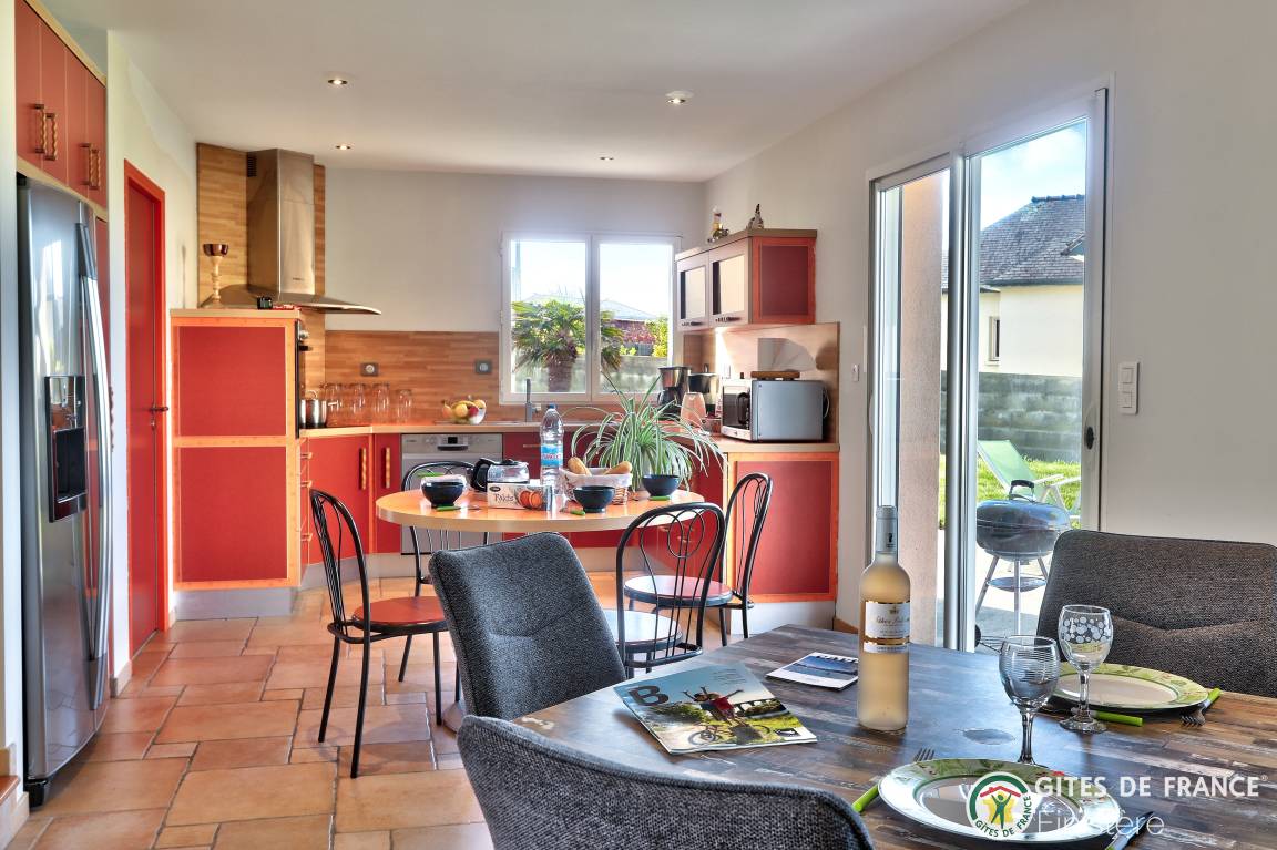 „Maison bien équipée et agréable avec sa grande pièce de vie avec cuisine ouverte et ses baies vitrées sur le jardin Petit bémol sur le lit en 140 qui mériterait d' être changé pour un 160 et ainsi plus confortableAutre petit bémol, la table et les bancs en bois sur la terrasse mériteraient aussi d'être remplacés par une table et des chaises de jardin plus confortables et plus modernes.La salle de de bain est spacieuse.Nous avons apprécié de pouvoir ranger nos affaires partout (habits dans la chambre, nos affaires dans la salle de bain et notre épicerie dans la cuisine) . Le cadeau de bienvenue était appréciable (une bouteille de cidre et des gâteaux bretons) La plage située à 600 mètres était agréable. Nous avons passé un bon séjour“