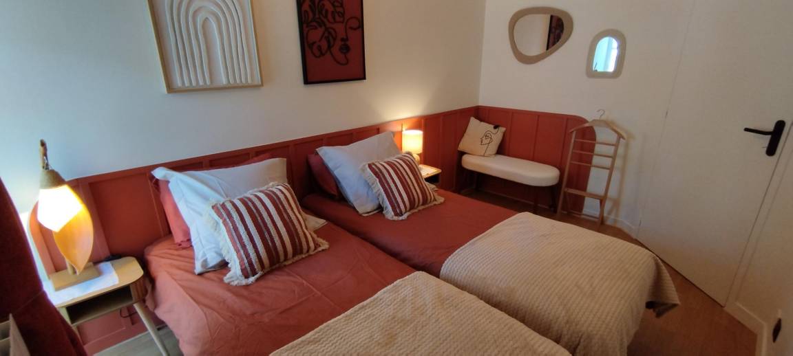 • Ein Schlafzimmer mit einem 160x190 cm großen Bett, das auf Anfrage beim Eigentümer in zwei 80x190 cm große Betten umgewandelt werden kann