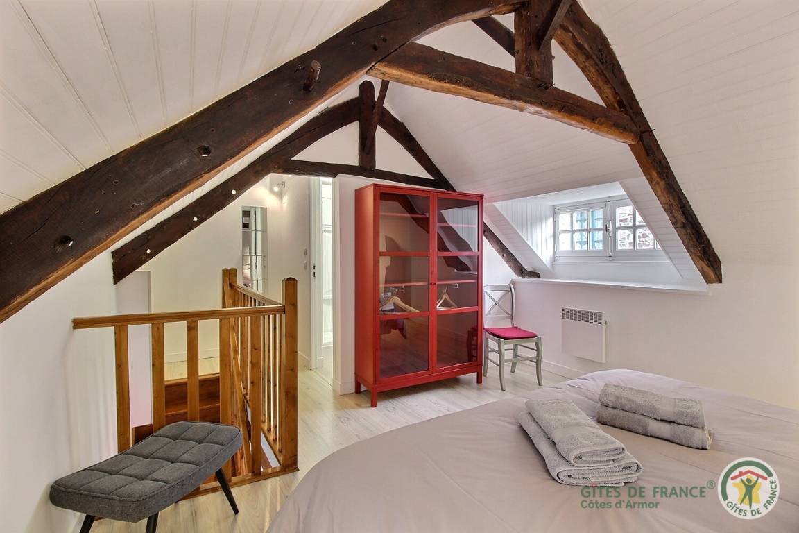 ein großes Schlafzimmer im Zwischengeschoss (1 Bett 180x200), Badezimmer (Duschkabine und Toilette).