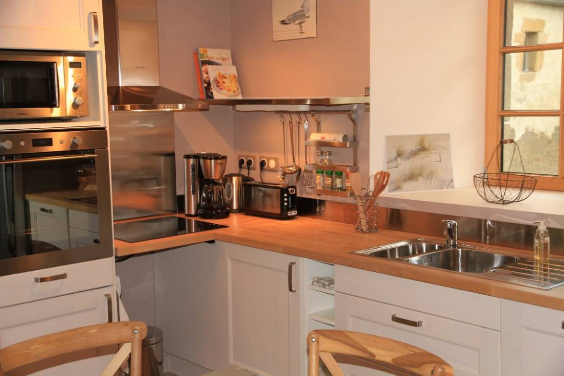 Dieses Haus war damals das Nebengebäude eines Herrenhauses vom 16th Jahrhundert, das 2012 renoviert wurde. Es steht im Dorf, 800m vom Strand entfernt. Betten bei Ankunft bezogen. EG (für Personen mit einer Behinderung geeignet) : Küche mit Ess- und Sitzecke mit Holzofen, Doppelbettzimmer (Bettbreite 160cm) mit Dusche, WC. 1. Stock : Doppelbettzimmer (Bettbreite 160cm), Zweitbettzimmer, Bad, WC, Mezzanine mit Zustellbett auf Anfrage. E-Heizung, WiFi, ADSL. Umzäunter Garten, Gartenmöbel, Grill, Terrasse, Garage.
