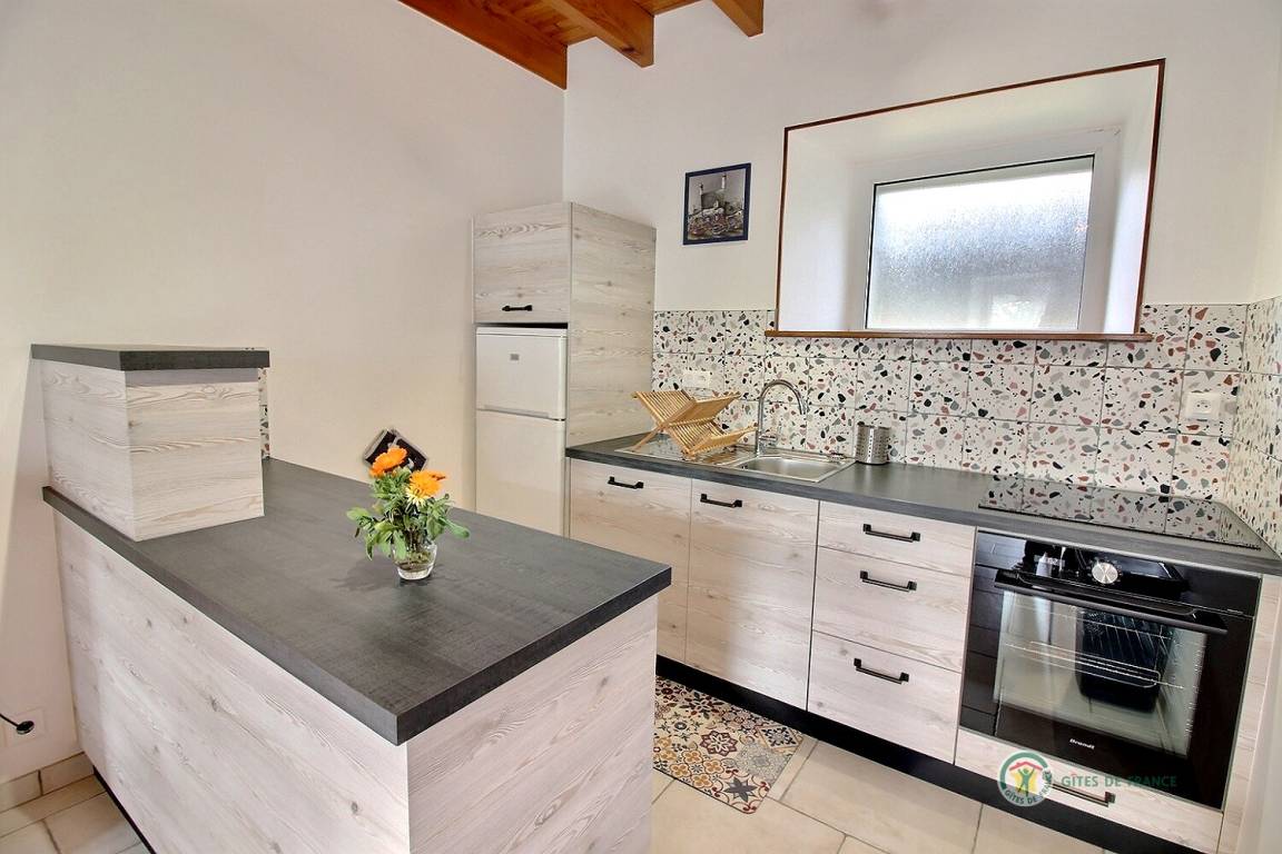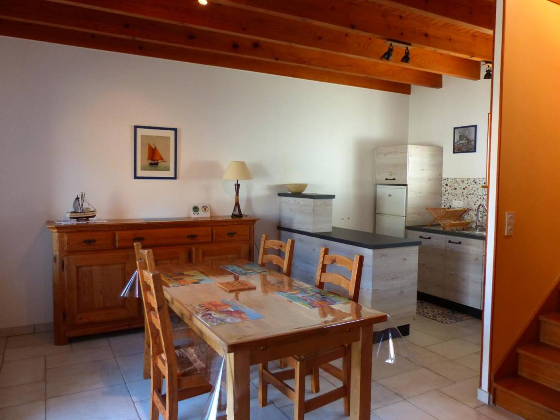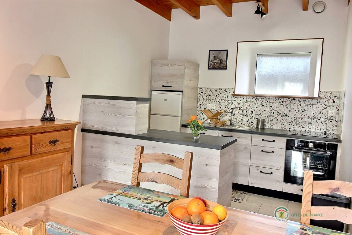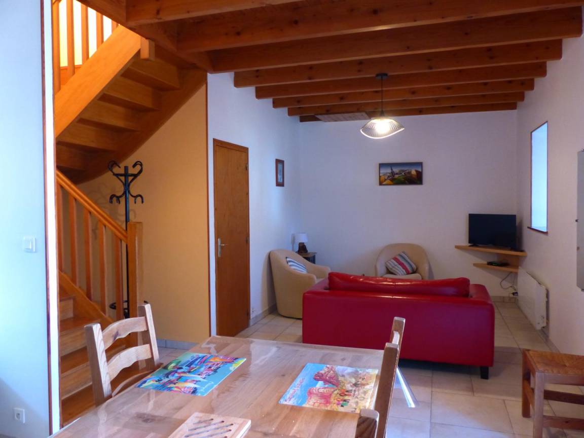 Erdgeschoss: Wohnzimmer mit Essecke, eingebauter Küche, WC. Etage: 2 Schlaf-Zi. (1 Doppelbett, 2 Einzelbetten, 1 Kinderbett aus Holz), Bade-Zi., WC. Gemeinsamer Hof, Rasen, Waschmaschine und Grillplatz gemeinsam mit den anderen Gîtes.